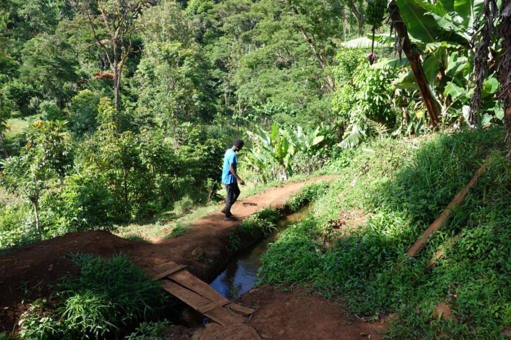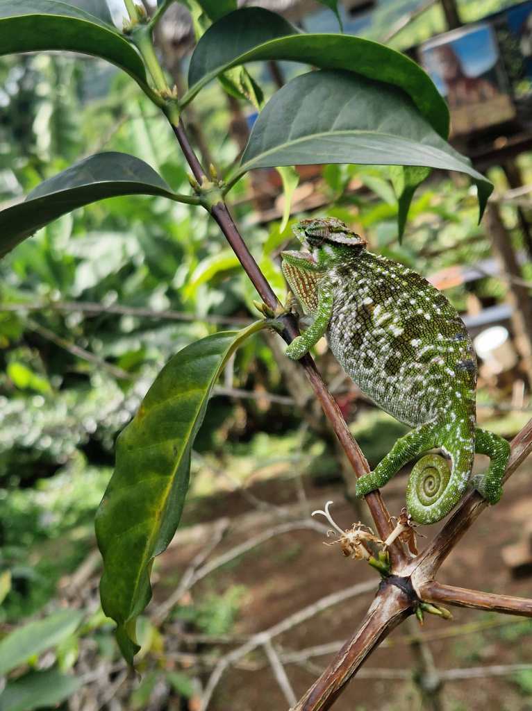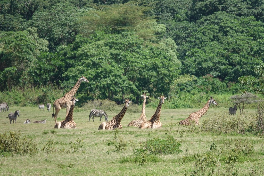 Indeed, the visitor centre was quite busy with groups preparing to climb Mt Meru, but once we had passed the gates into the park itself, there were almost no other tourists. Unlike more popular destinations, Arusha National Park has no lions or cheetahs; it is supposed to have some leopards but Estomih said he had never seen one here. The park also has quite dense vegetation, making spotting wildlife harder. But as we found out, despite the lack of big cats, there are lots of other interesting things to see here. Just after the entrance we came across a group (or “tower”) of giraffes in a clearing.