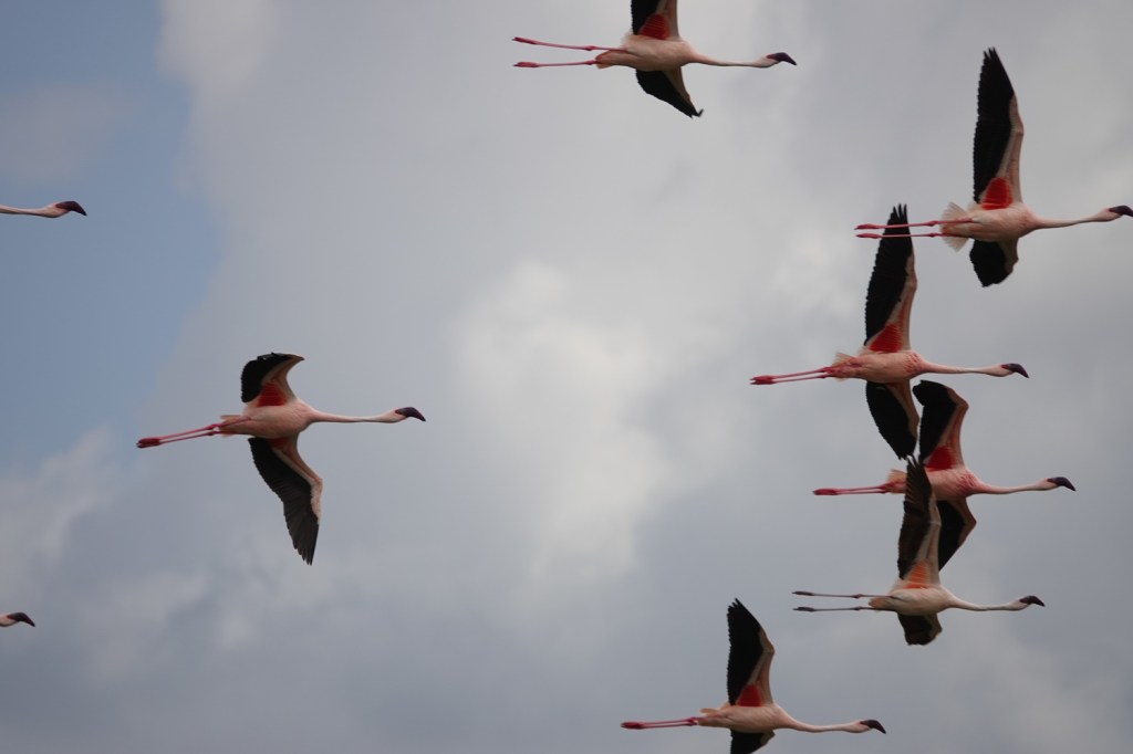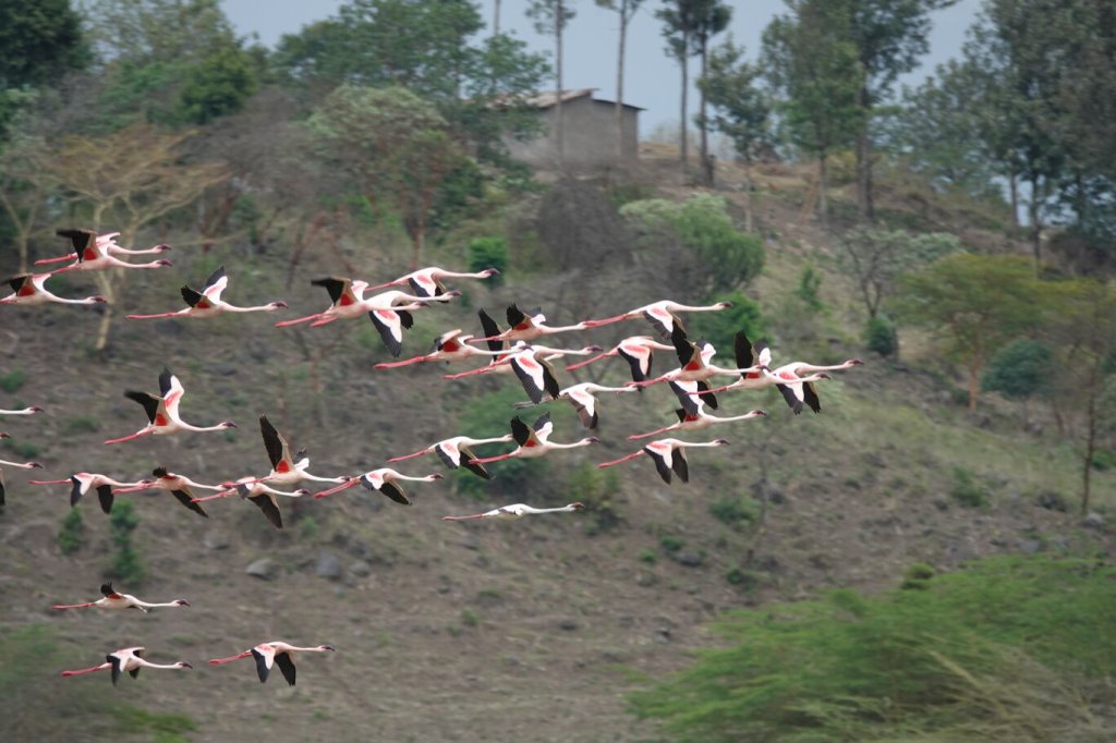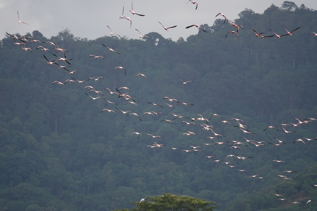 Our route took us to the Momela Lakes, one of the park’s other highlights. At the Big Momela Lake we found large flocks of flamingos. Although we had seen these birds several times before in Tanzania, this time we were lucky since for some reason they decided to put on a spectacular flight display for us. It was the first time we had seen a large group of flamingos in the air, and it made for an amazing sight, a bit like an aerial display by an elite fighter jet team.