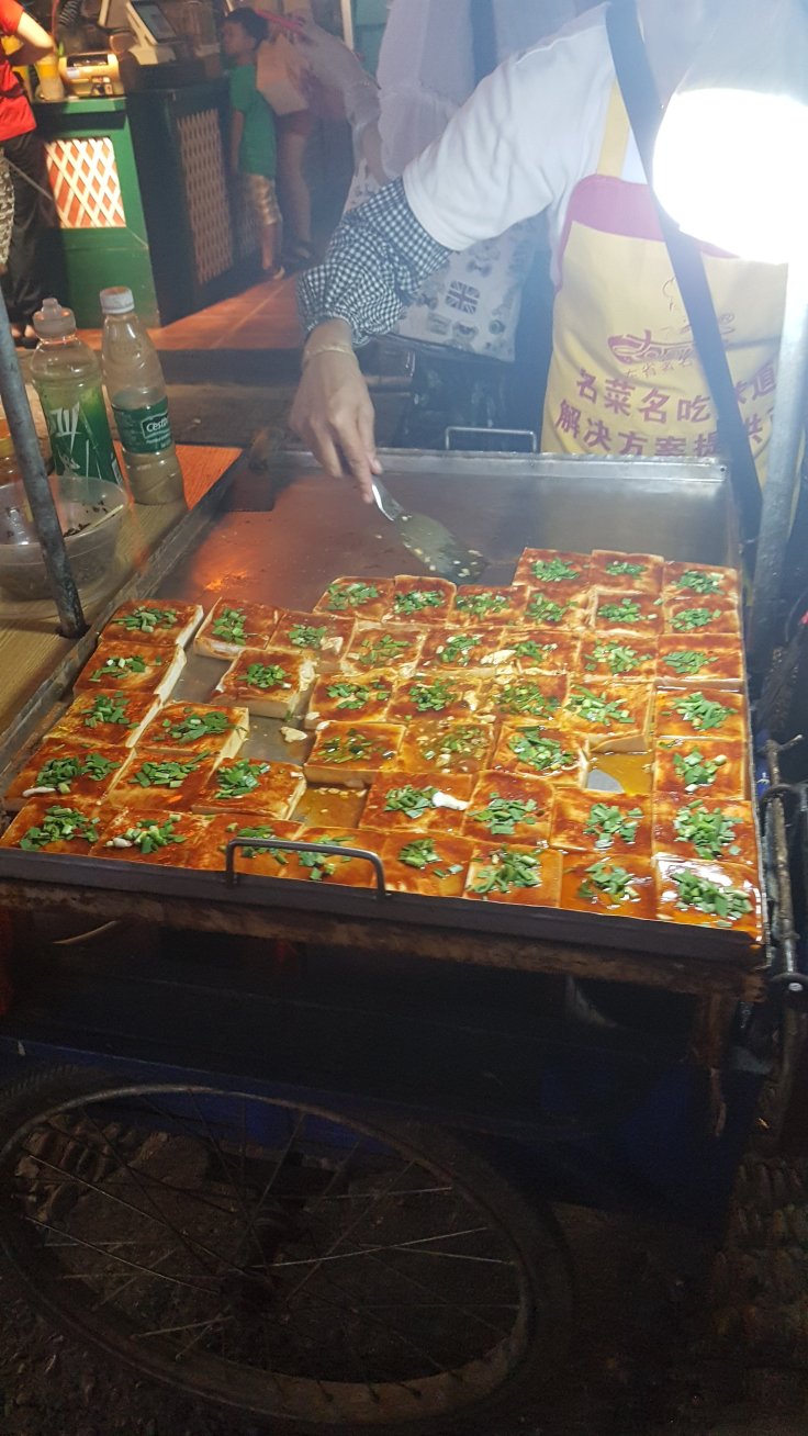 On the way out, I tried to go souvenir shopping again and bought myself some street food tofu. These are sold everywhere and taste good but are a little spicy.