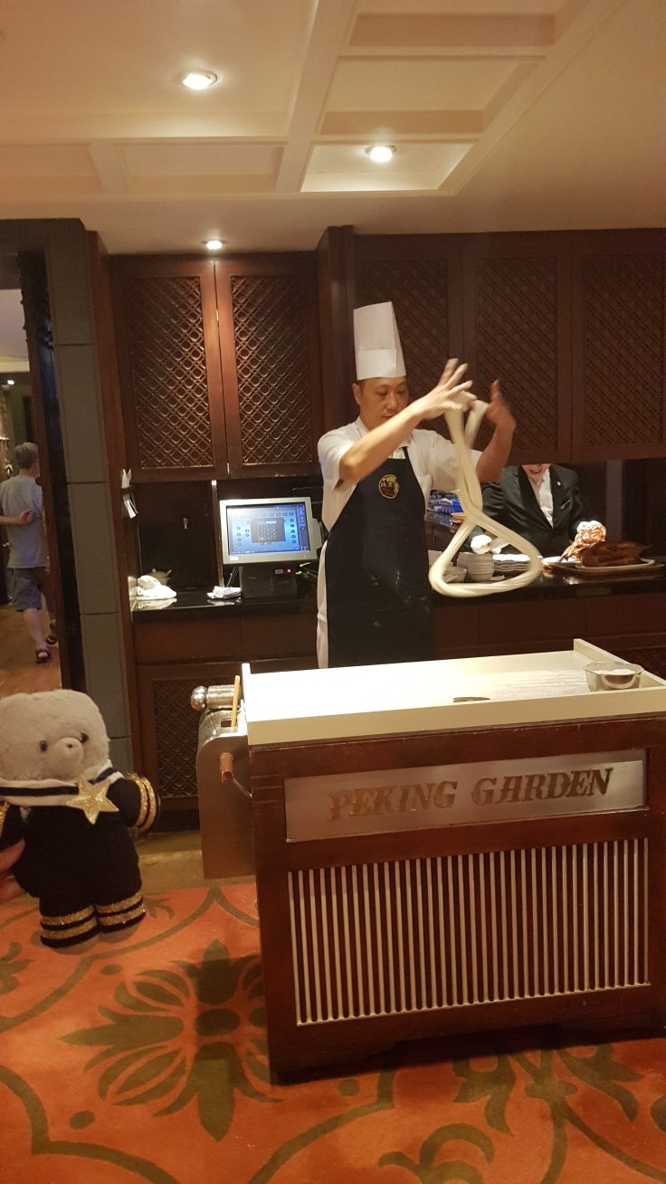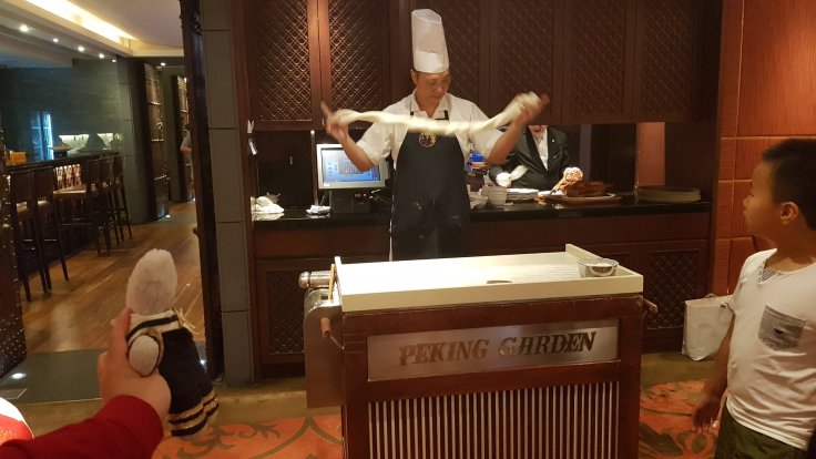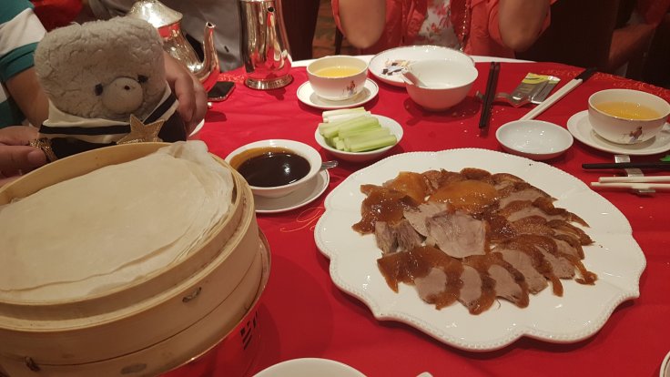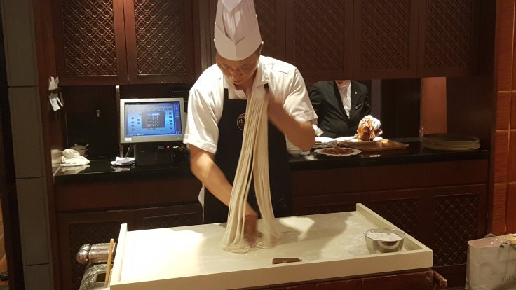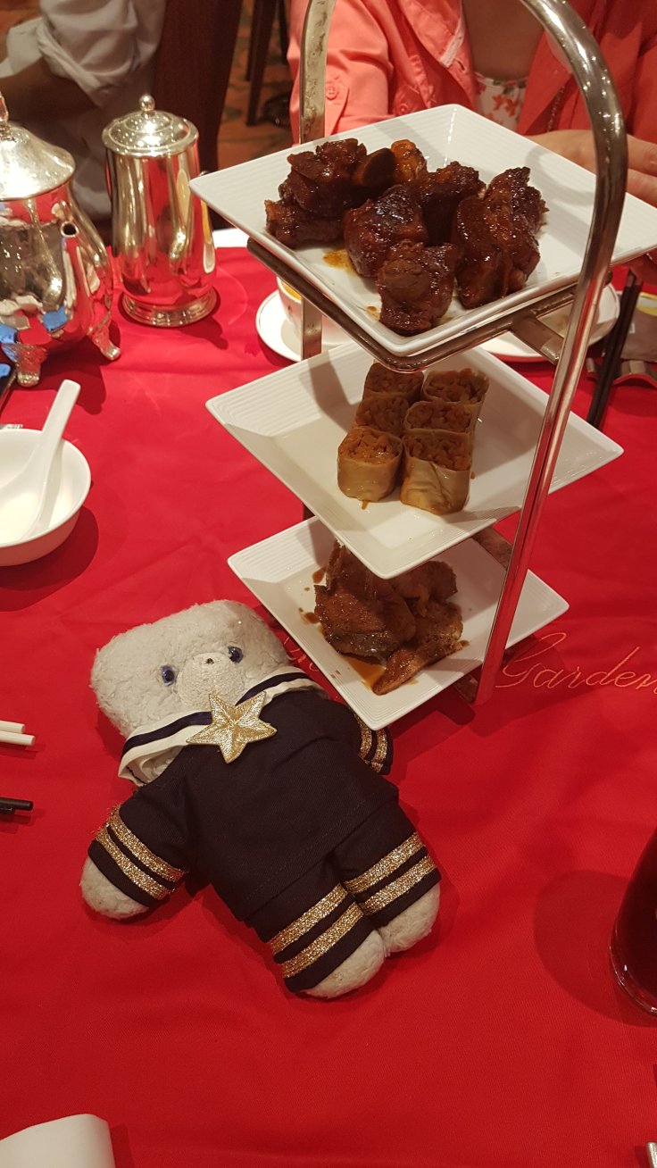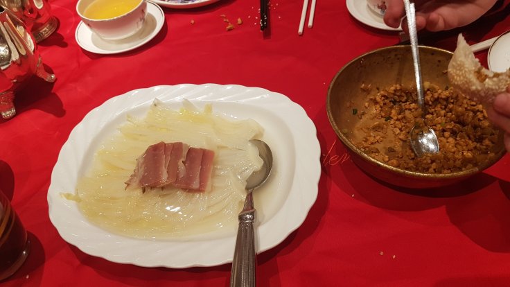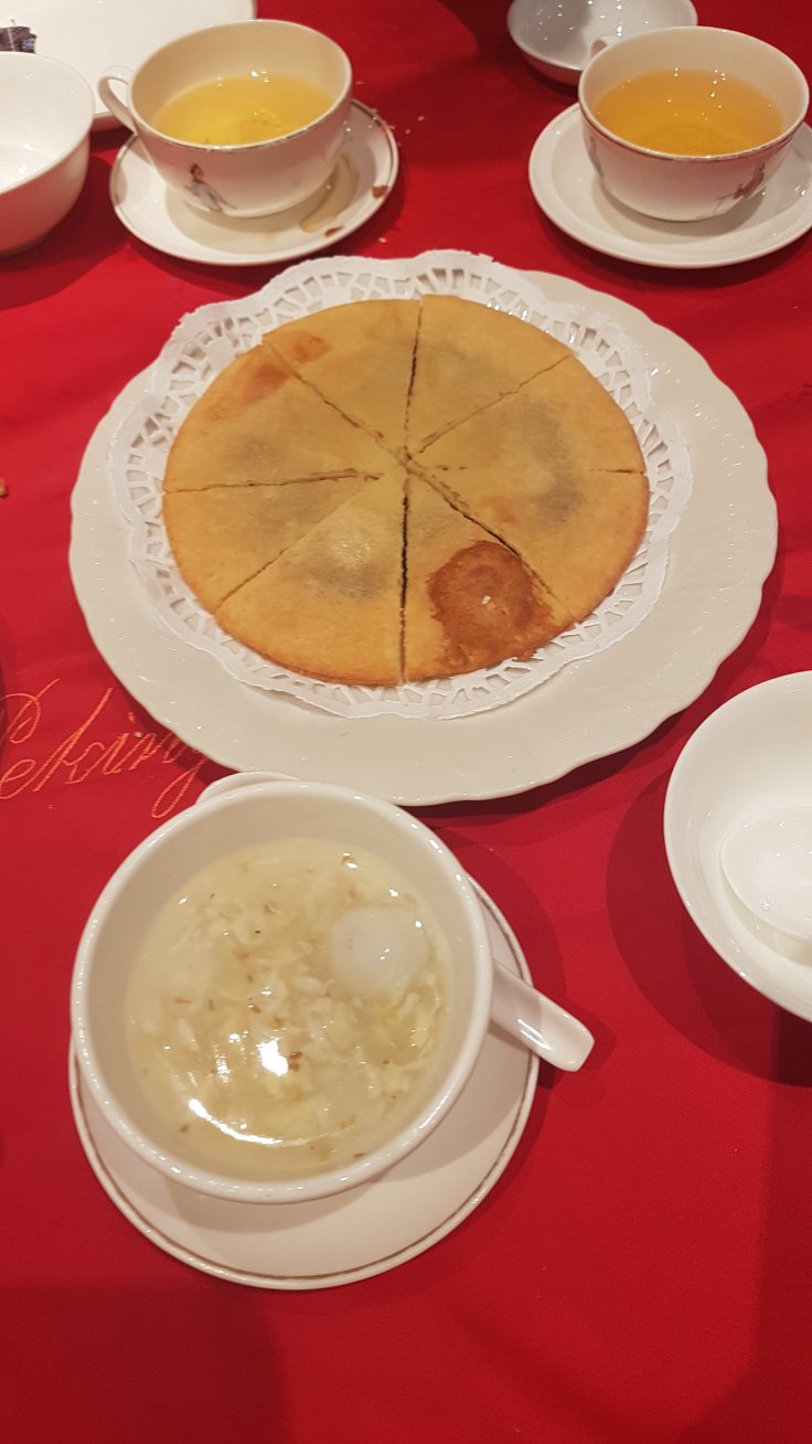 Date pancake and rice balls flavoured with osmanthus in liquor soup.