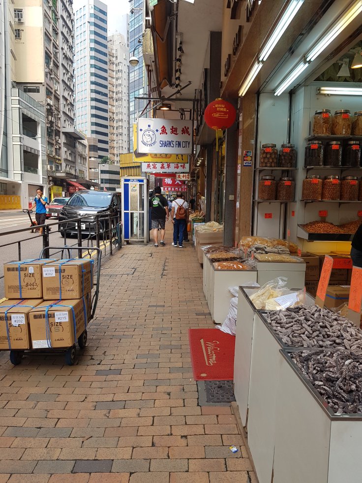 Passing by some herbal Chinese medicine and dried fish shops.