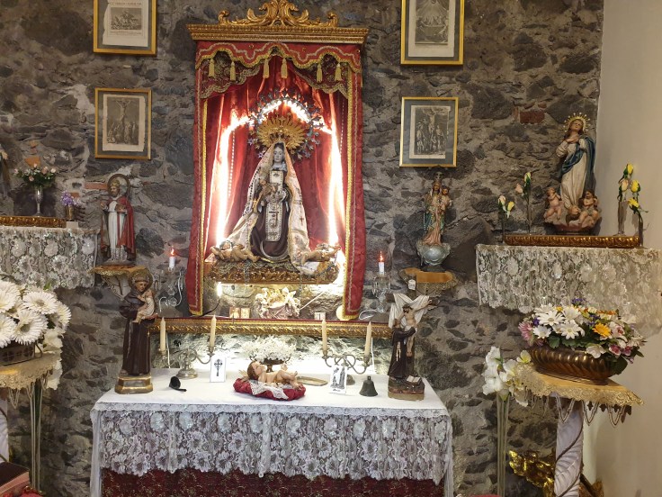 At the entrance was an old cast iron gate, then steep stairs leading up to a landing and a dining room with balcony over the street, kitchen, bathroom, a sitting area underneath a glass sunroof, and….. the house’s very own private chapel with a statue of the Virgin Mary and various images of Christ.