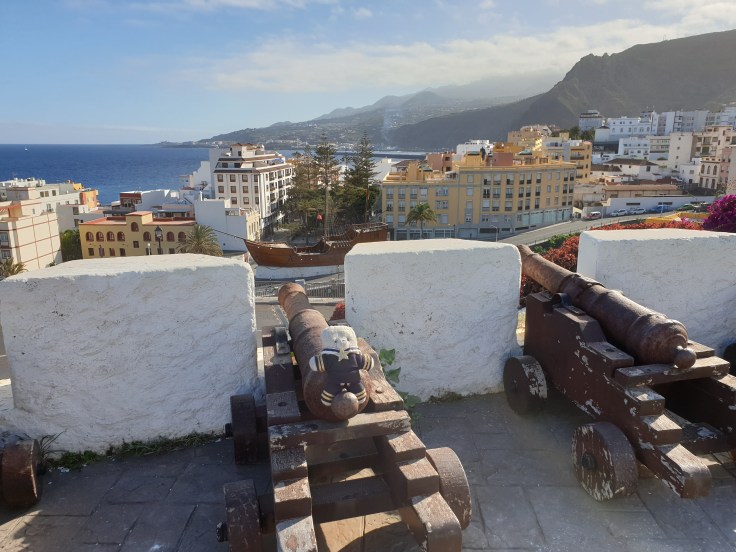 Having explored my home for the next four nights, I set off to visit the town. Santa Cruz is a small but pleasant place. Old town houses like mine with balconies line the streets, reminding me a bit of the Middle East, but there was also a sprinkling of ugly modern holiday flat buildings. I walked East to the edge of the town. where on top of a rock bursting with brightly colours flowers, there was an old fort with nice views of the sea.