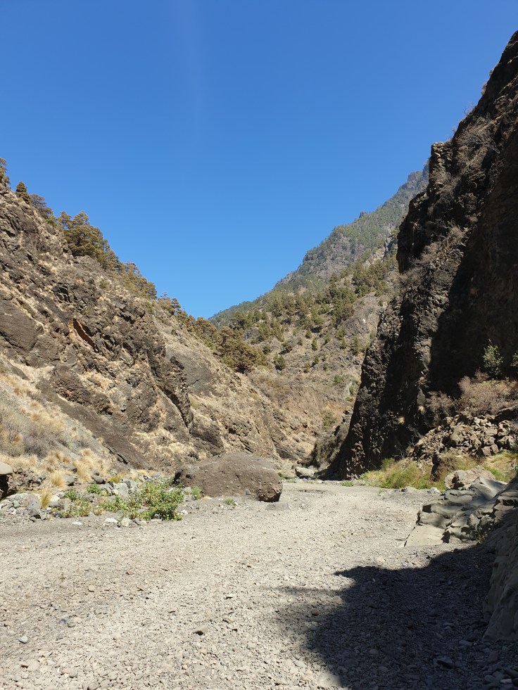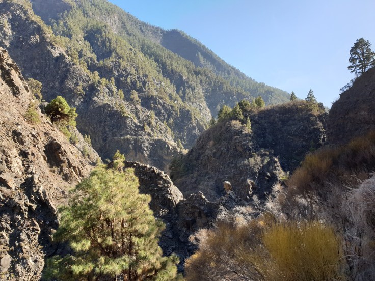 I intended to do a short walk somewhere near the main entrance to the park, but on arrival I was told that I needed a permit to enter by car, and had to go back to the visitors’ centre a few km down the road. At the visitors’ centre they said they had sold out of permits for the day (surely they could have said that at the park entrance…..?). I looked at my map and decided to try another entrance at the west of the park. I drove through a couple of sleepy small towns and then along a narrow mountain road that initially led steeply up before descending into a dry river valley, where I found a car park. I noticed a sign indicating a path to the Cascada de los Colores, 5.4km away, and remembered that I’d seen this waterfall mentioned on websites, which said it was one of the highlights of La Palma, and showing pretty pictures of an imposing waterfall falling over bright red and orange rocks.