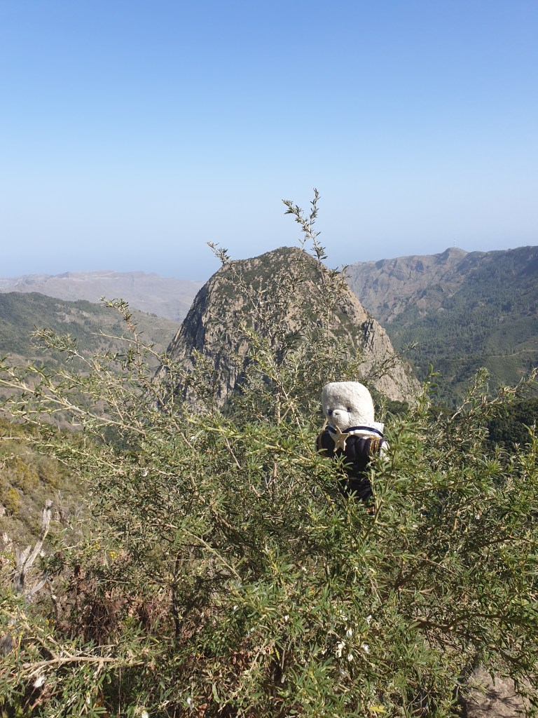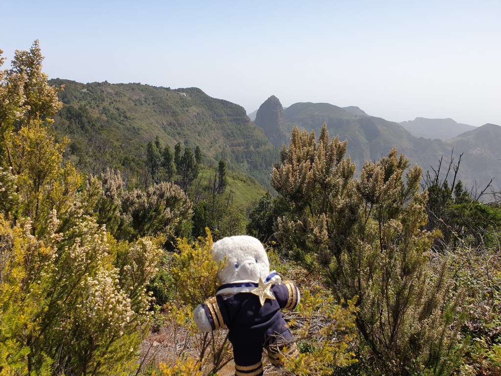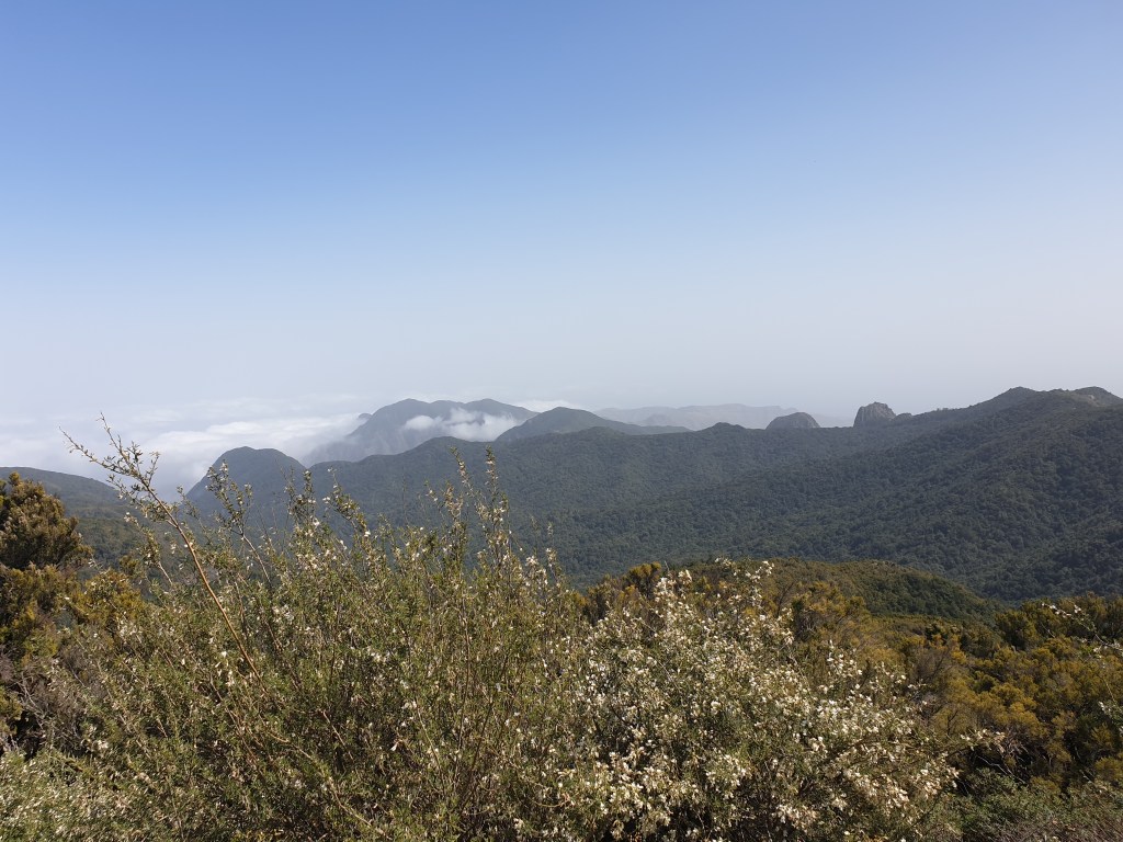 I drove up the valley road again and through the long tunnel into the park. At the mirador, I found signposts for route 18, but was a bit surprised that they said it was 14km long and should take 7 hours…. The hike started easily enough, along the top of a mountain ridge with fine views of Los Roques in the bright sunlight…..