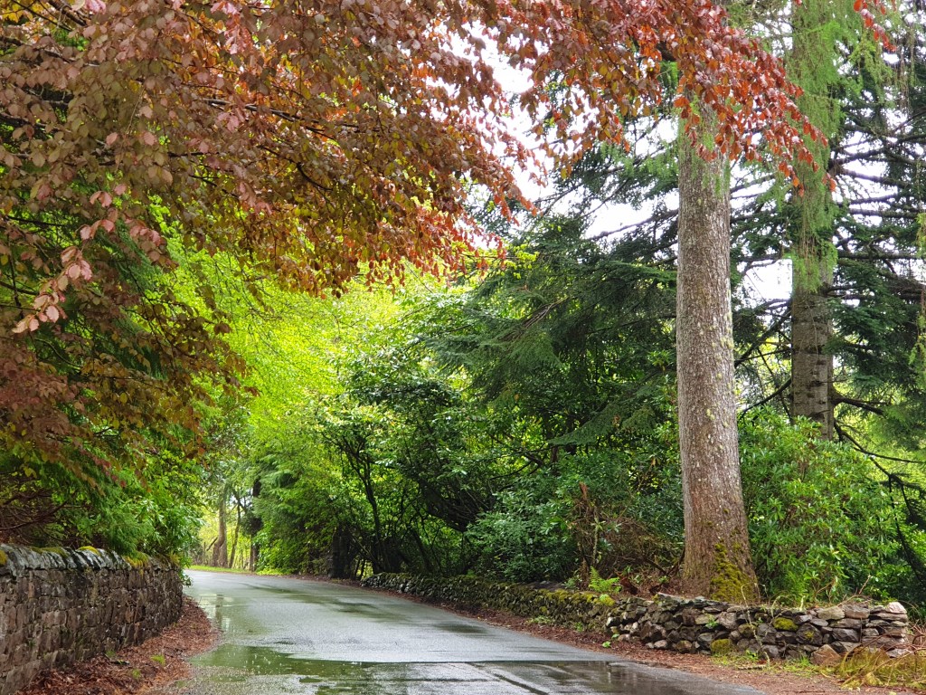 The road across to Scotland’s east coast first wound through pretty forests, with groves of rhododendron trees that were just starting to flower