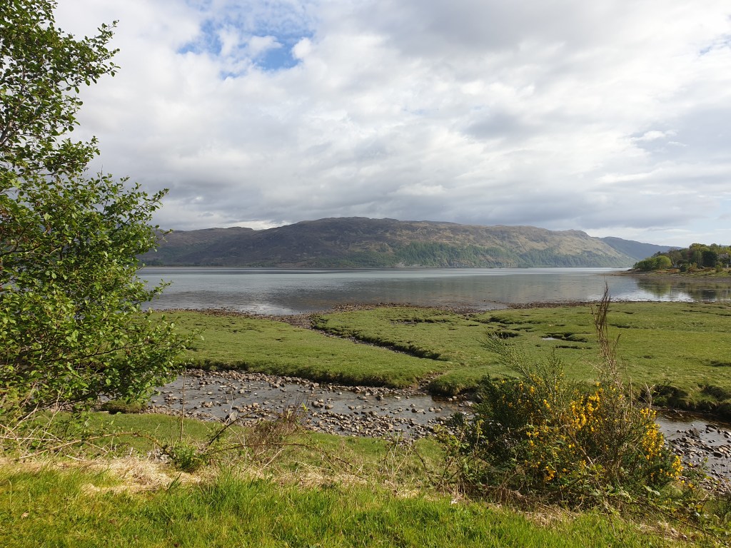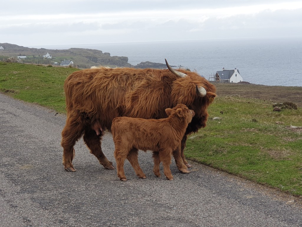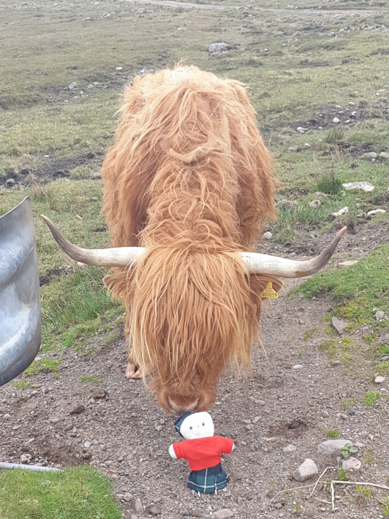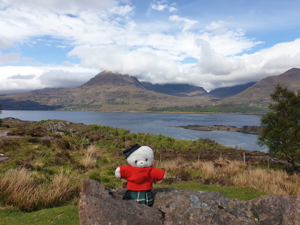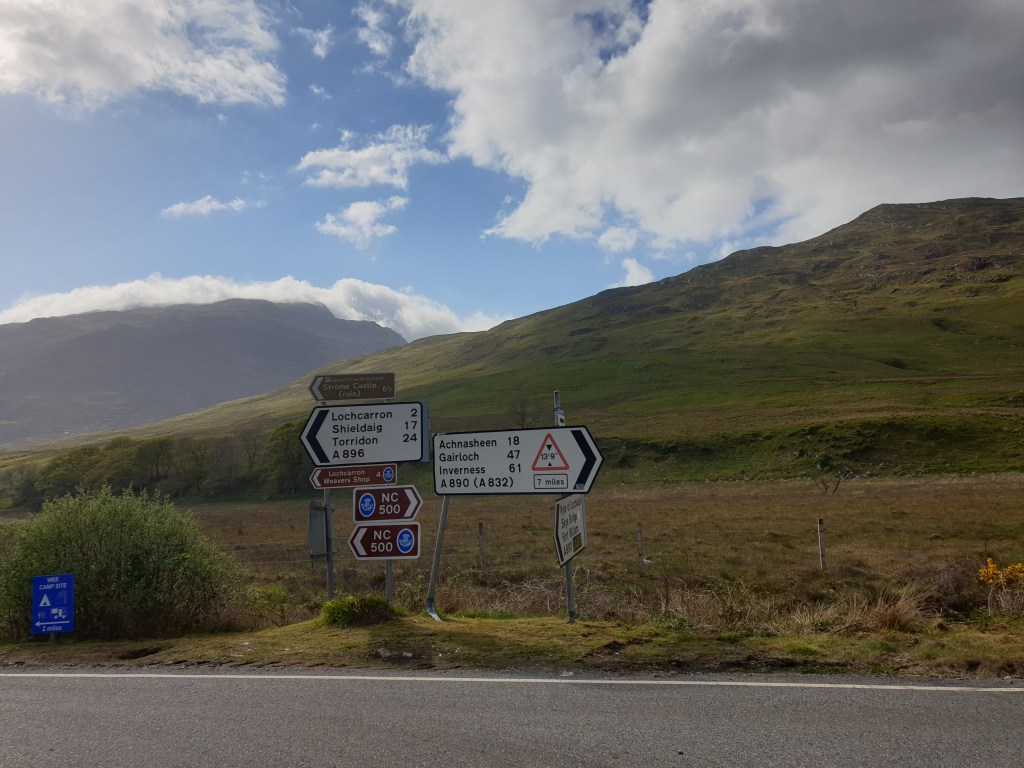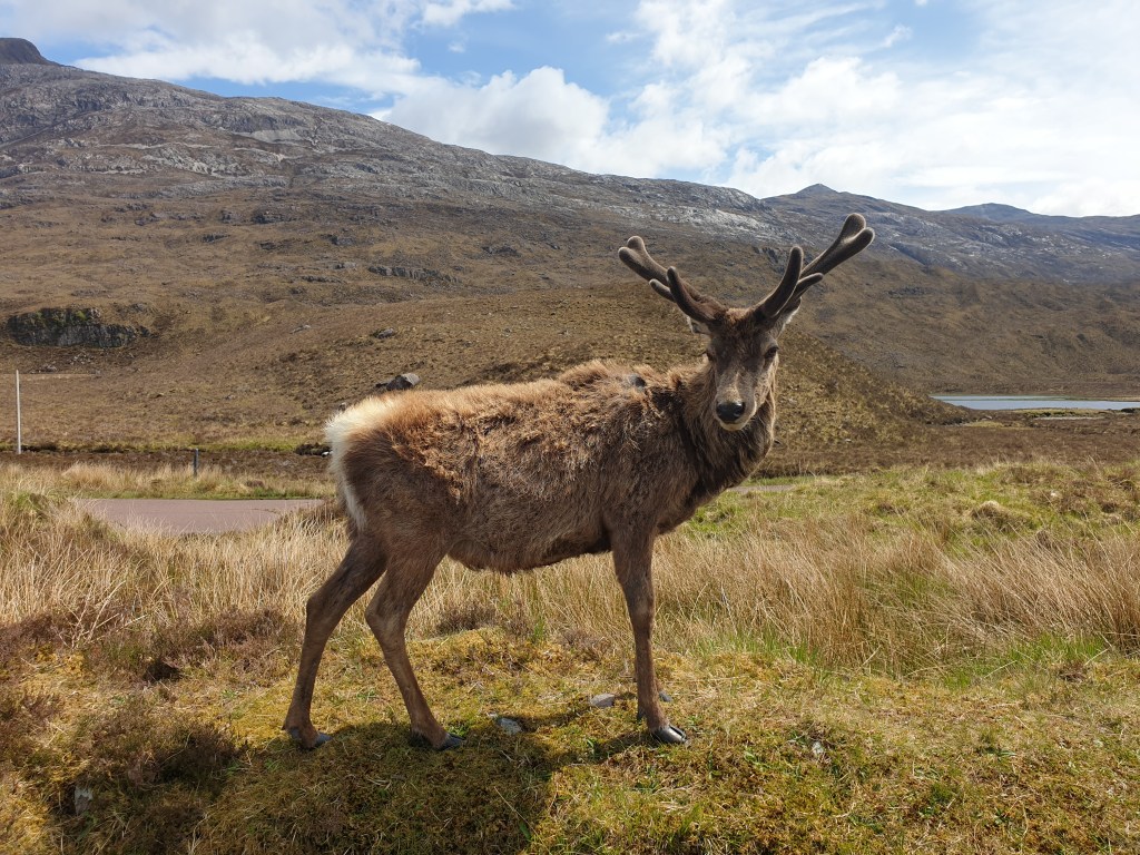 I often had to squeeze past other cars and thought that it was good to be driving the NC500 in May – in high season, the road might be too busy to enjoy. At Kinlochewe, the NC500 turned off down the Torridon valley, with more mountains……… and an unexpected friend standing right by the side of the road, unperturbed by passing cars.