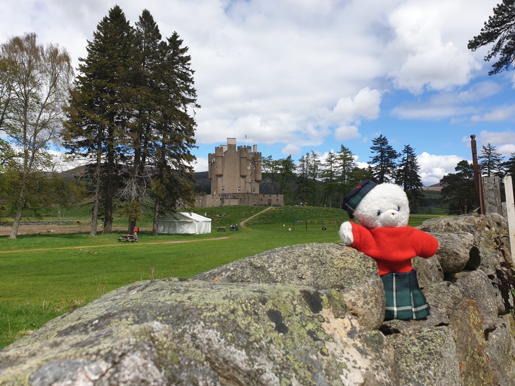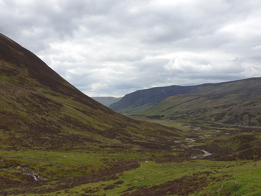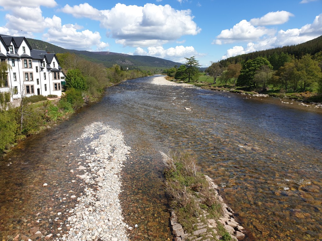 My road then took me back to the Cairngorm Mountains. At first it went through green meadows, with the snow-topped mountains flitting in and out of view in the distance. I stopped briefly at the pretty little town of Ballater, on the River Dee…..