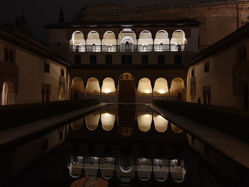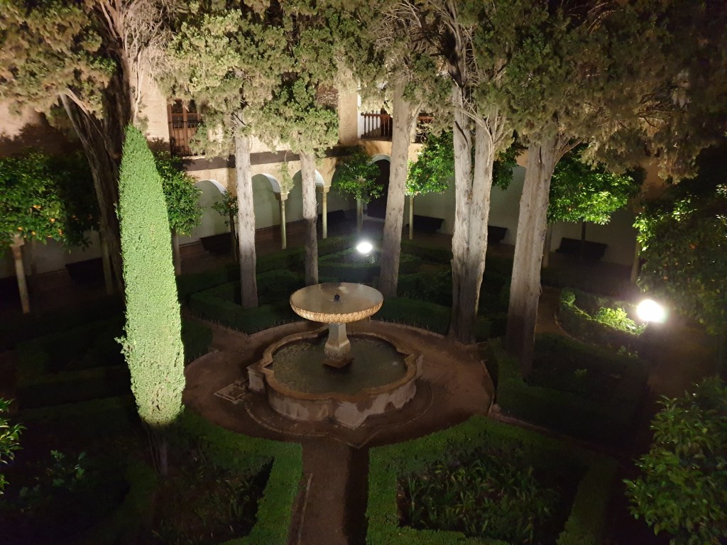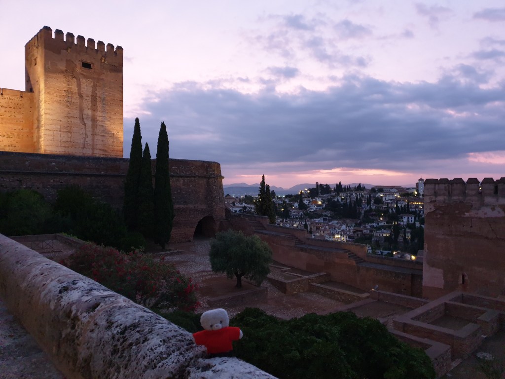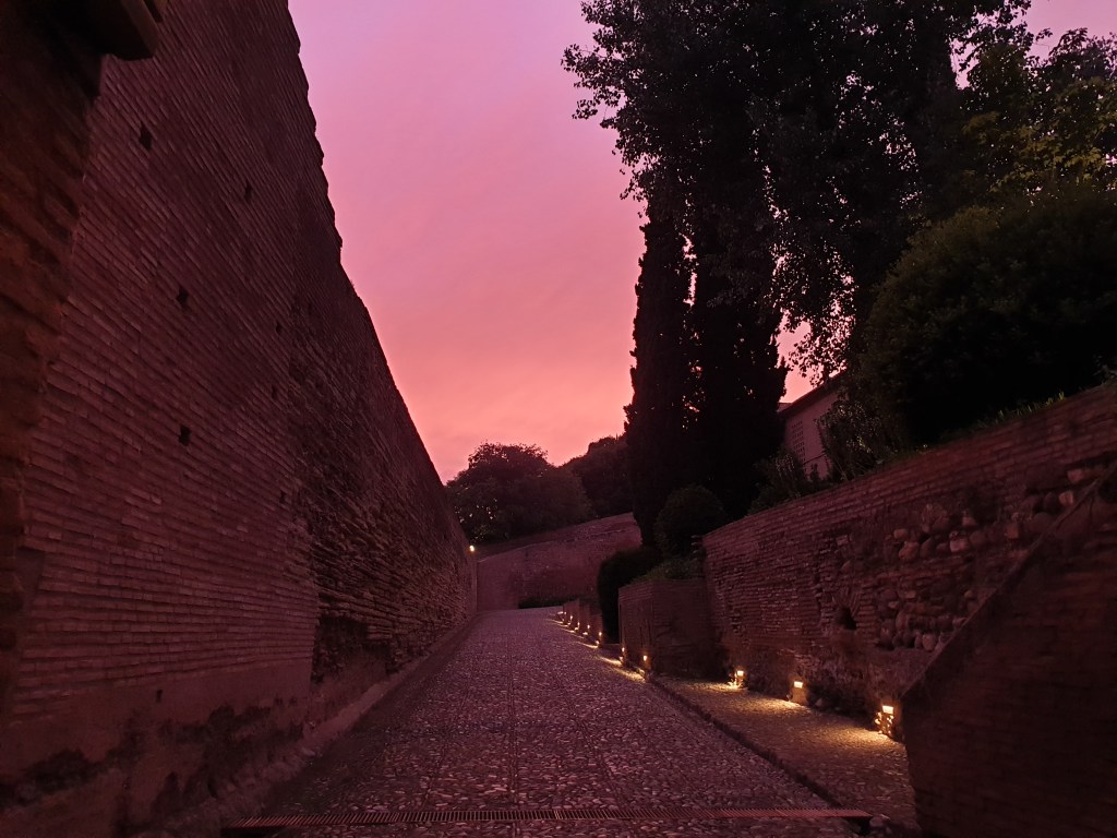 After checking in, I popped into town briefly to buy something to cook for dinner, and sat out a thunder shower in my hotel room before heading up the steep hill to the Alhambra for a night-time visit of the Nasrid Palaces. The Alhambra was really atmospheric in the dusk…….