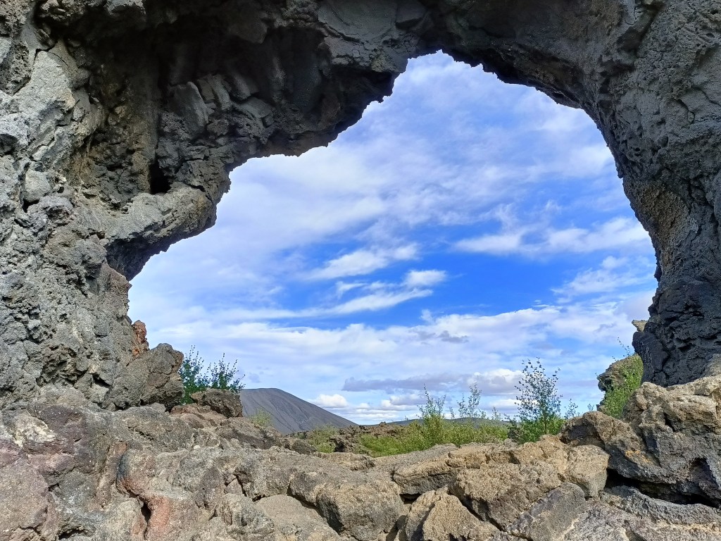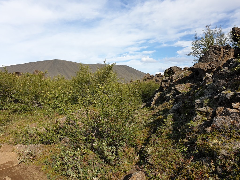 Next stop was Dimmuborgir, on the east side of the lake. Here the lava from the eruption had made many strange shapes. I stopped for a coffee in the café at the entrance to the site and noticed an interesting item on the menu – “lava bread”. This is bread made by placing dough and yeast underground, where the cooking is done by geothermal heat. I resolved to set off on a short walk and to buy some bread when I returned. After wandering around a bit on the many marked paths, I spotted a path leading to the volcanic cone of Hverfjall, about 2km away. The path up to the foot of the volcano was very pretty, with lots of flowers and strange lava forms.