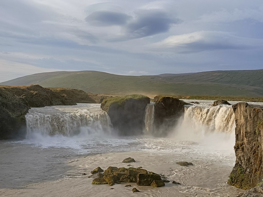 Today I faced a long drive from Myvatn, roughly half way along Iceland’s north coast, to Holmavik at the entrance to the western fjords. My map said I could drive the 500km in six and half hours, but based on past experience I knew that it would take much longer after stops were added on, so I set off early. First stop was another of Iceland’s famous waterfalls, the Godafoss or “waterfall of the gods”. Helpfully it is located right on Route 1.