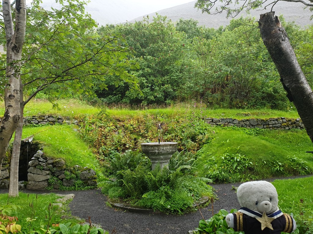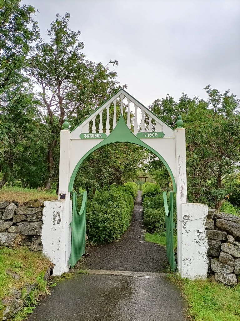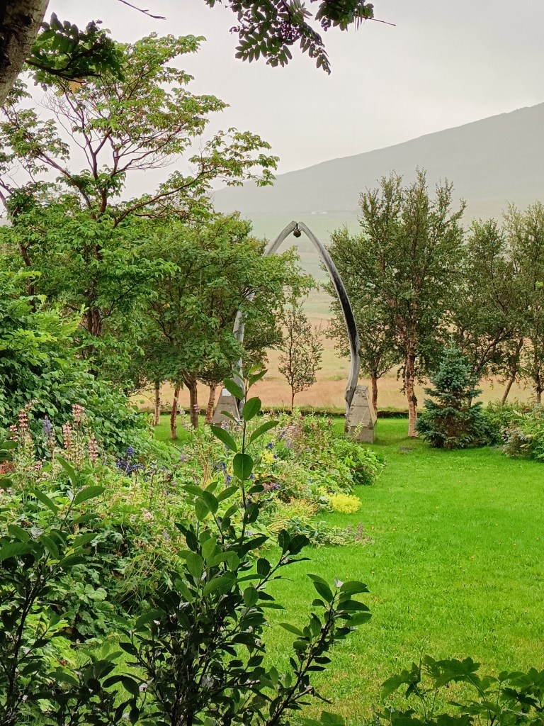 My next destination was very much off the beaten track – the tiny botanical garden of Skrudur. I found it after a short drive up a lonely road, and was not surprised that I was the only visitor. Skrudur will never make it onto a list of “top ten things to do in Iceland”, but I was curious what a botanical garden in this utterly remote location near the Arctic circle might be like. As expected, it was small, nestling discretely in a valley under huge mountains. To my surprise the gardeners has succeeded in growing trees – in the rest of the Westfjords there is only grass and bushes – and some wild strawberries that were nearly ripe. There was a sundial (I suppose some days this might be useful) and an interesting archway been made from the jaw bones of a blue whale. The place had a quiet charm and felt like a Garden of Eden in the middle of a barren, wild wilderness.
