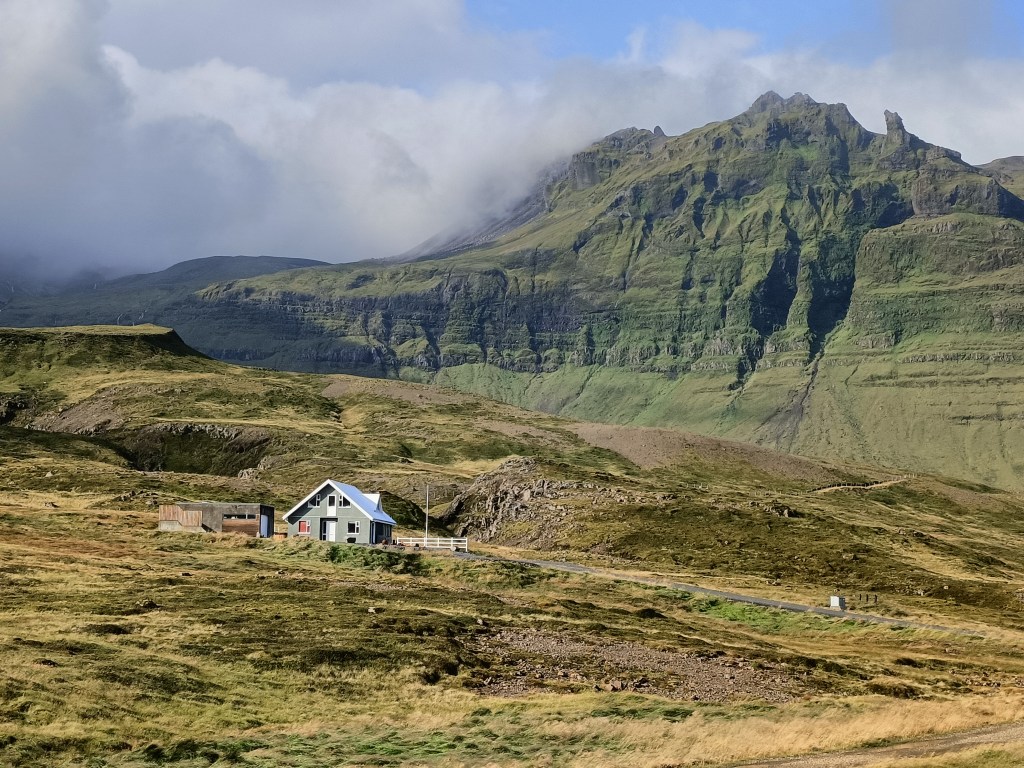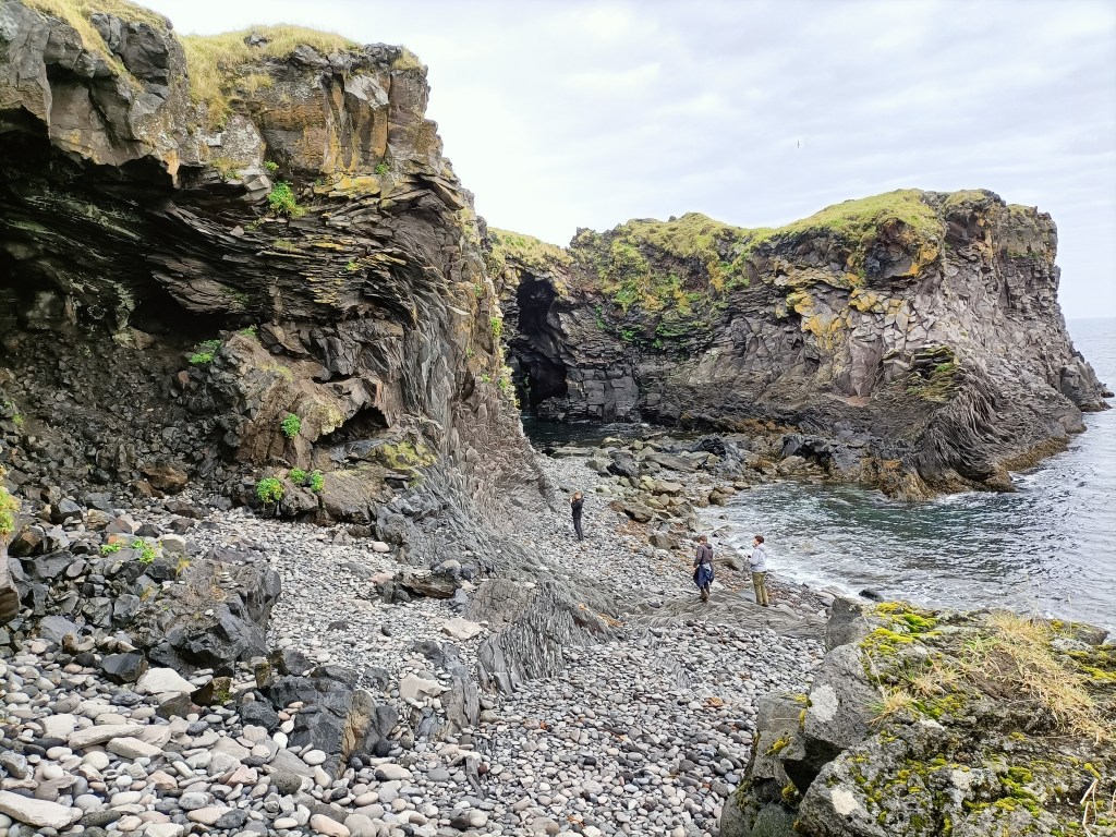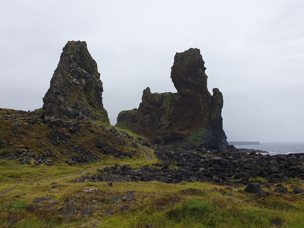 I continued west in the hope that the good weather would continue and I would see the massive Snaefellsjokull glacier that covers the western end of the peninsula, but cloud blew in from the sea, and I found myself driving through mist. I abandoned my plan to drive to the very tip of Snaefellsness, to a spot where you can apparently see whales in the sea – I wouldn’t see more than 100 metres. Instead I made a few small stops, one at Malariff by the sea, where there are more strange lava formations………..