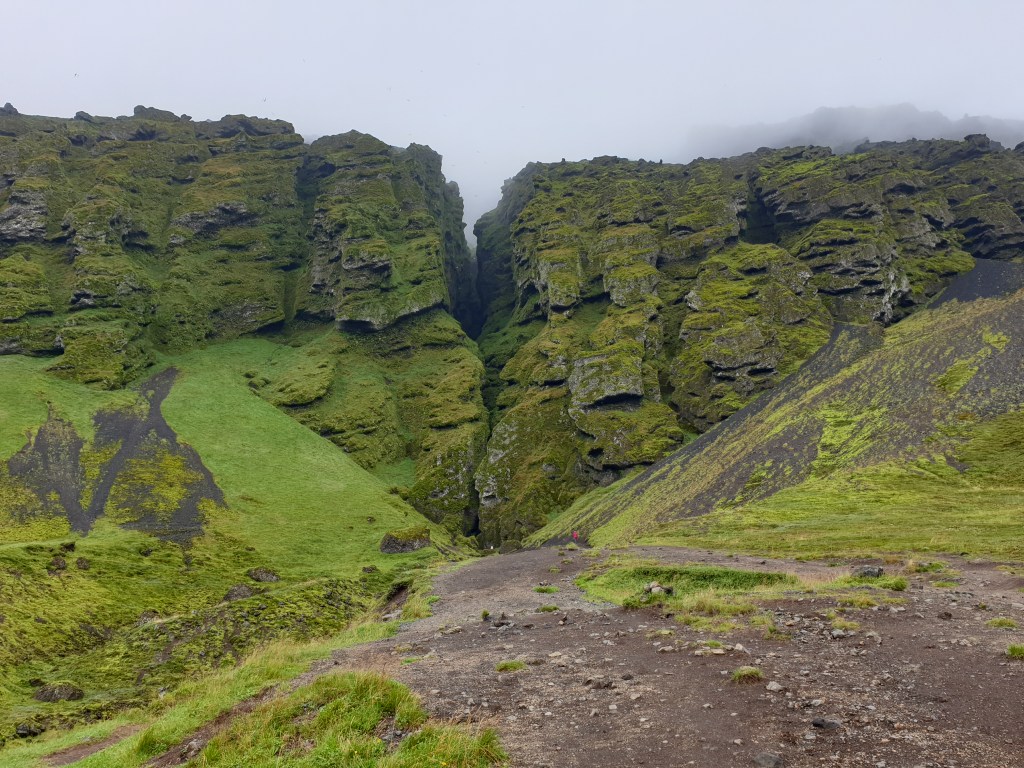 ……….and finally at Raudflesgja, where a stream emerges from a strange cleft in the mountain. I walked in as far I dared; if you are willing to get your feet wet, it is possible to walk into the cleft for quite a distance.
