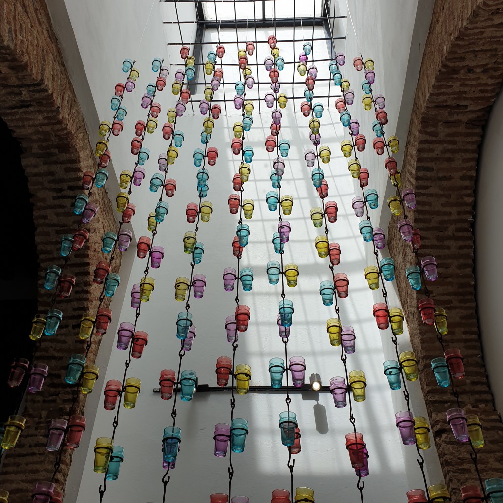 The combined museum of the Kasbah and contemporary art had the same problem – a beautiful old building but not much interesting art or many artefacts of old Kasbah life. Each room had its own security guard wearing a bullet proof vest, who would greet me, wait for me to quickly scan the exhibits, and direct me along a passageway or up stairs to the next room in a bizarrely convoluted route through the museum. The guards smiled broadly, as if they thought that my procession was as comic as I did. I at least snapped this striking installation of coloured tea glasses…….