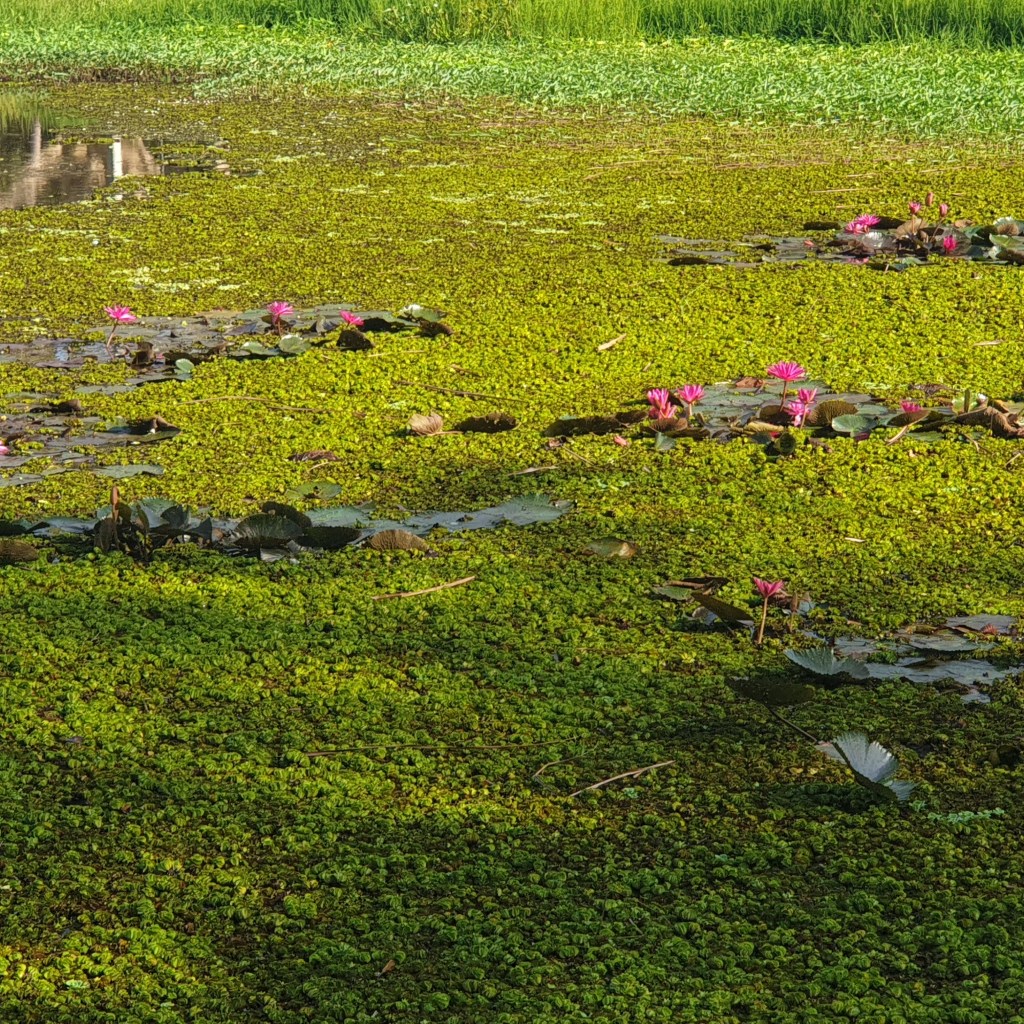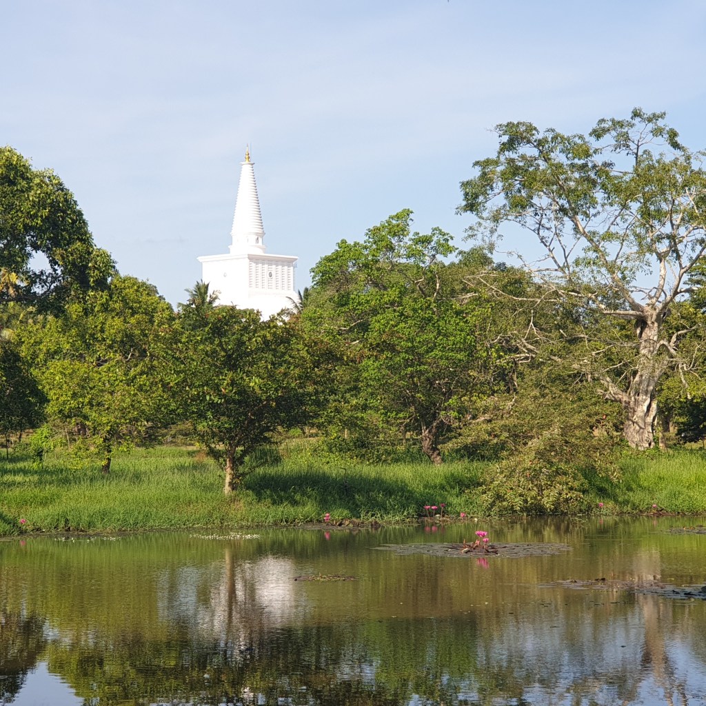 I got up early again – it is so much nicer cycling in the cool of the morning – and set off to see the remaining sites that I had not had time for yesterday. First up was the Sri Maha Bodhi, the world’s oldest documented tree. It sits in the geometric centre of Anuradhapura and is surrounded by very large parking area to accommodate crowds of pilgrims at festivals. Today it was quiet, the car parks were empty, and I could leave my bike very close to the entrance. I stopped to admire a beautiful lake with lilies and many birds, with a brilliant white stupa reflecting off the water.