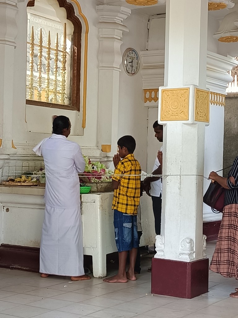 The usual routine was needed to enter an inner courtyard housing the tree with its shrine – shoes and hat off, and security check (the shrine was the site of a bloody terrorist attack by Tamil separatists during the Sri Lankan civil war). The tree itself was a normal looking fig tree with its branches supported by golden scaffolding, but the surrounding shrine had a very special feeling to it. Pilgrims streamed in, bringing offerings of flowers or rice. Someone gave me some flowers to make my own offering, and like the other visitors I placed them to make an appealing pattern.