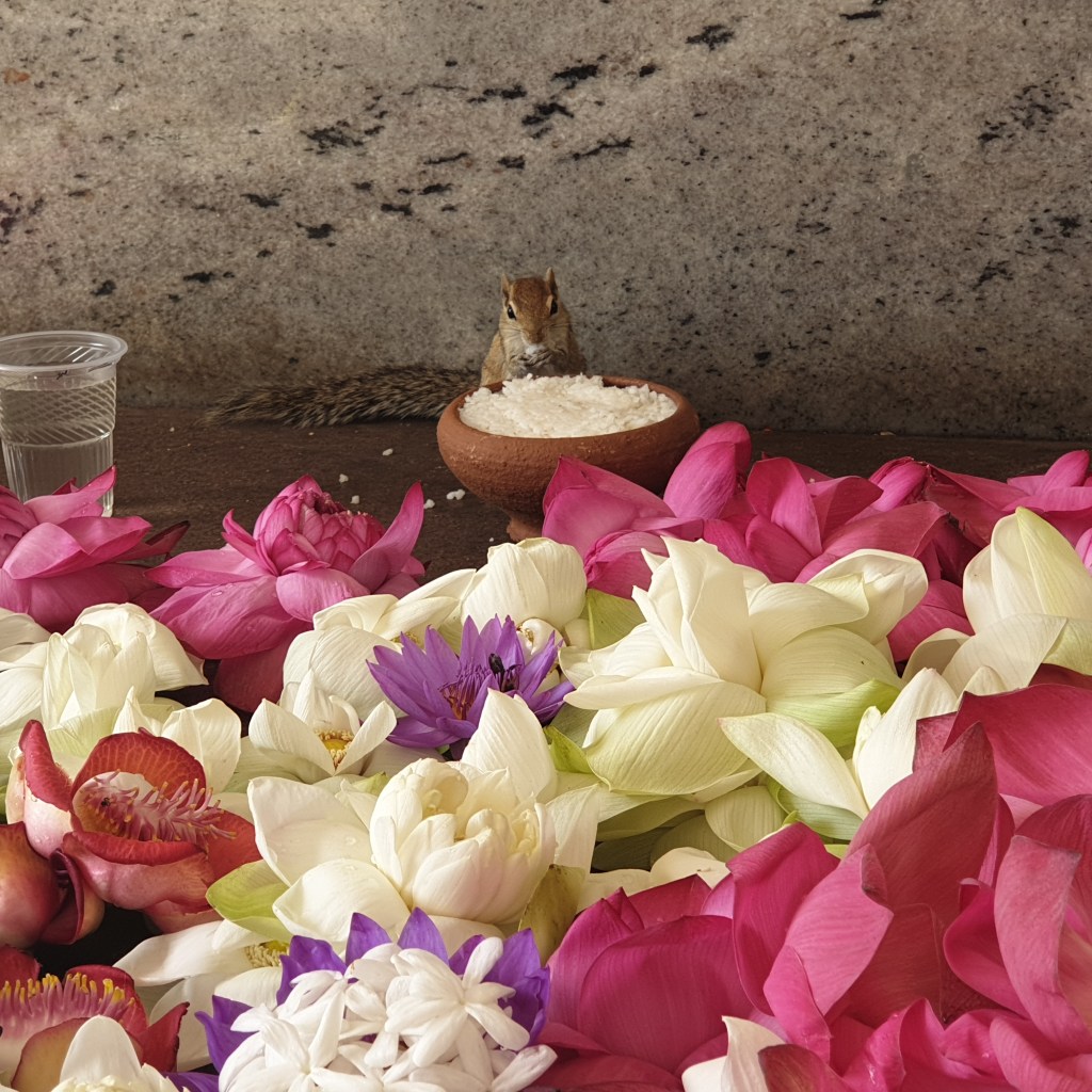 Other pilgrims and local worshipers sat on the ground, praying with beautiful chants, which were half-way between singing and talking. The combination of the cool morning air, the chanting, and the strong smell of flowers gave a deep feeling of peace, and I sat down and closed my eyes to enjoy it.