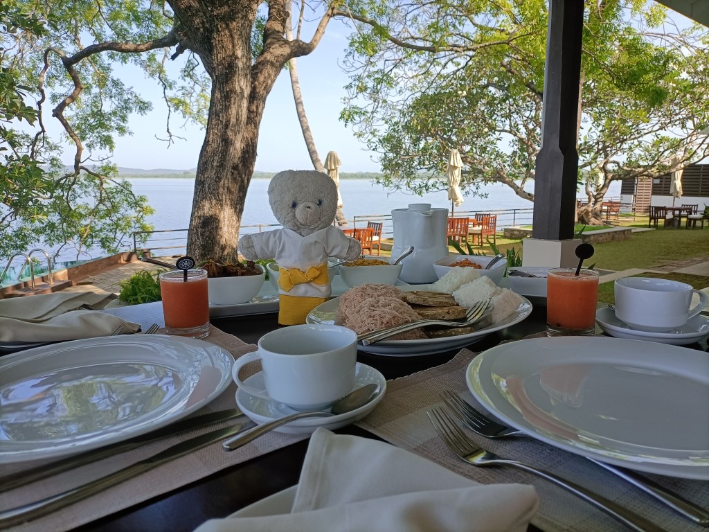I had a curry dinner, which in true Sri Lankan style was accompanied by a dazzling array of vegetable side dishes. Next morning, I continued my observation of the lake and glimpsed an Indian otter. I asked for breakfast to be set up outside my room, which the staff did with enthusiasm (there were a lot of staff and not many guests). Sri Lankan breakfast closely resembled dinner – chicken curry, rice, and a big selection of side dishes. The array of food attracted the attention of a local monkey, and I got the services of a dedicated waiter with a gun to stand nearby to scare him off (the waiter explained that the gun was empty and just meant to scare the monkey).