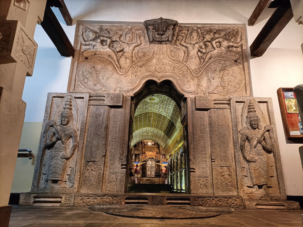 Next I started my visit to Kandy’s main attraction – the Temple of the Sacred Tooth Relic. This shrine houses a tooth said to have been taken from Buddha’s funeral pyre and smuggled to Sri Lanka in 483 BCE. It was located in successive Sri Lankan capitals including Anuradhapura and Polonnaruwa – before ending up in Kandy. The tooth was seized by the Portuguese in the 16th century and burnt, only for the Sri Lankans to reveal that the burnt tooth was a replica, and that the real one had been hidden for safe keeping. The complex was built over many years, from 1687 to 1782, and also housed the royal place.