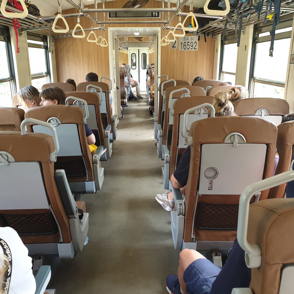 It was very pleasant leaning out of my window and either watching the scenery go by or observing the frenetic activity at each station as passengers with unreserved tickets fought to get on the train first in the rush for a possible free seat. The train doors are left open for the whole trip, and more adventurous passengers held on to the hand rails and leaned out of the open door for an even better view.