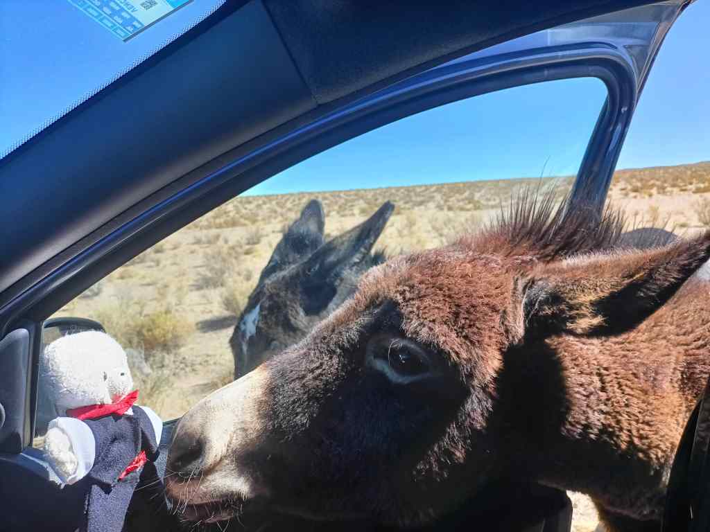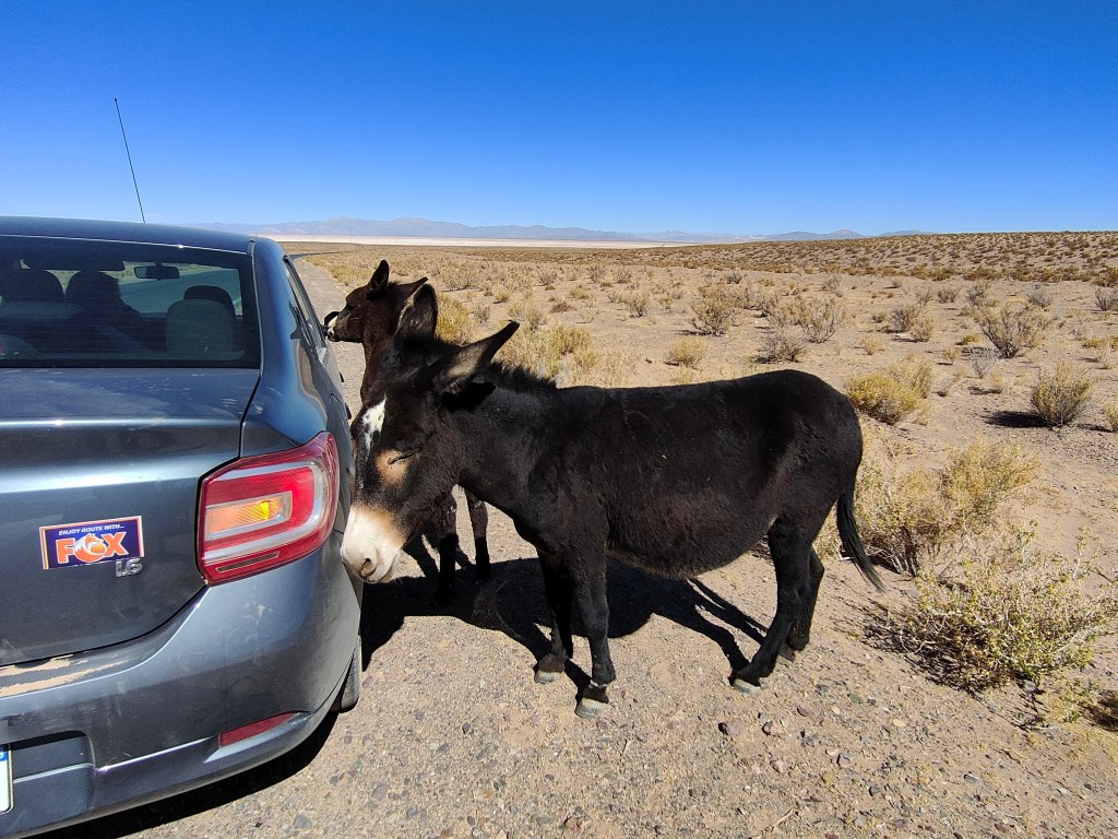 ….. before dropping back down again to a flat, white plain. On the way down I saw some wild guanacos (an animal similar to the llama). I stopped to photograph them, and my car was suddenly besieged by hungry wild donkeys that appeared out of nowhere. One pushed into my car to say hello….or perhaps to see if I was edible. Things were getting a little scary, when a large truck passed me and sounded its horn, scaring off the donkeys.