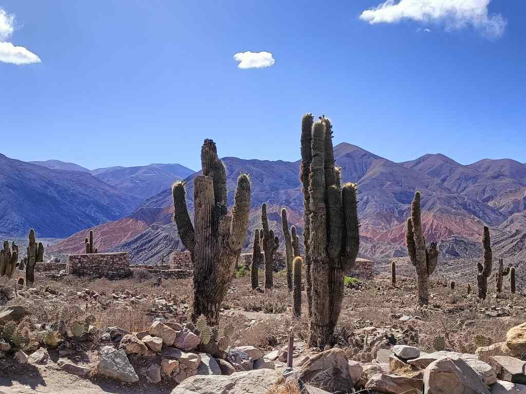 The straight open road continuing west from the salt plain beckoned me onwards. I would have liked to carry on driving all the way into Chile, only 100km away, but this wasn’t part of my complicated travel plan. Chile would have to wait until later in my trip. Instead, I drove back to Purmamarca and had a light lunch before heading north again, this time to the town of Tilcara. There I visited the Pucara, a site where archaeologists have restored an Inca village dating from Pre-Columbian times. The restored buildings were modest, and probably of interest only to specialists in Inca history, but the site offered amazing views of the main Humahuaca valley and a couple of pretty side-valleys. The Pucara also had an impressive collection of huge cacti.