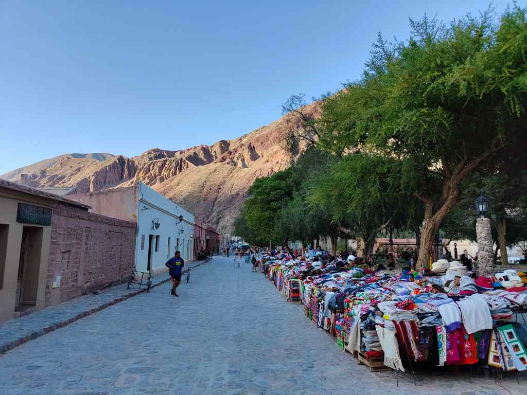 After a full day exploring, I was tired and headed back to Purmamarca. I enjoyed the now very familiar display of coloured mountains – this time with strong early evening sunlight, which gave yet another set of colours to the rocks. On arriving, I enjoyed a beer at an outdoor table of a café, admiring the final colours of the setting sun on the hills around the town.