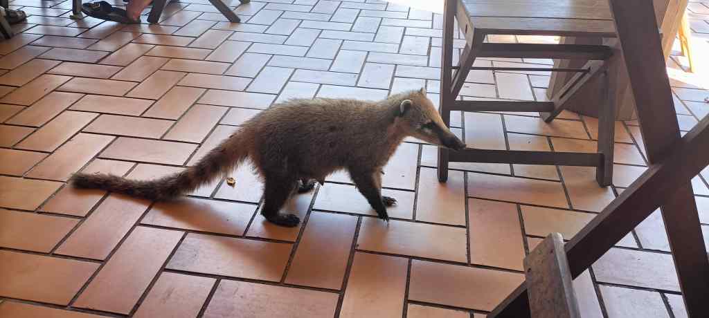 Visitors follow a path running along the river bank, giving a range of views. After a short walk I stopped for drink, and was met by a small friend (a coati) looking for food. I had none, which was just as well, since although coatis look cute, they can get aggressive in their search for something to eat.