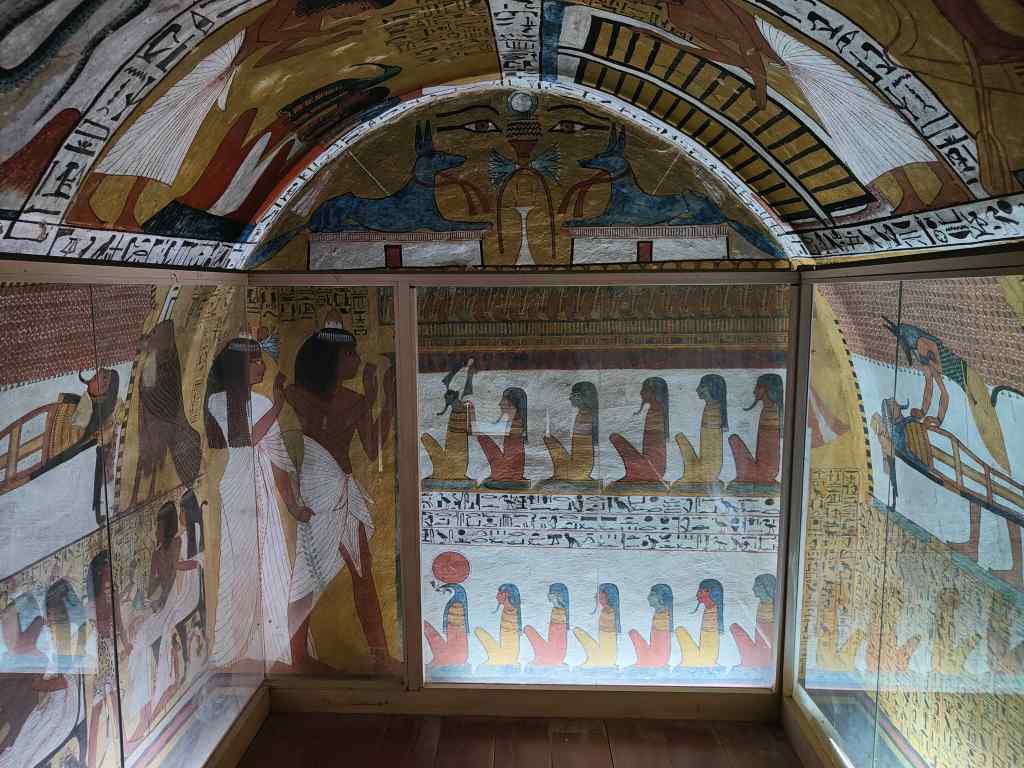 My next stop in Luxor’s West Bank was Deir al Medina, where many of the painters and sculptors who made the rich peoples’ tombs lived and were buried. There are hundreds of tombs here, and the hillside sometimes looks like Swiss cheese, but only a few of them were open. The few I managed to visit were all similar – small, with wall paintings of the owner’s body being prepared for the afterlife by mummification. The painting seemed like a recent restoration, rather than the original paint, but there was little explanation available anywhere. The tomb particularly recommended by my guidebook needed an extra ticket….which of course I had forgot to buy at the central ticket office.
