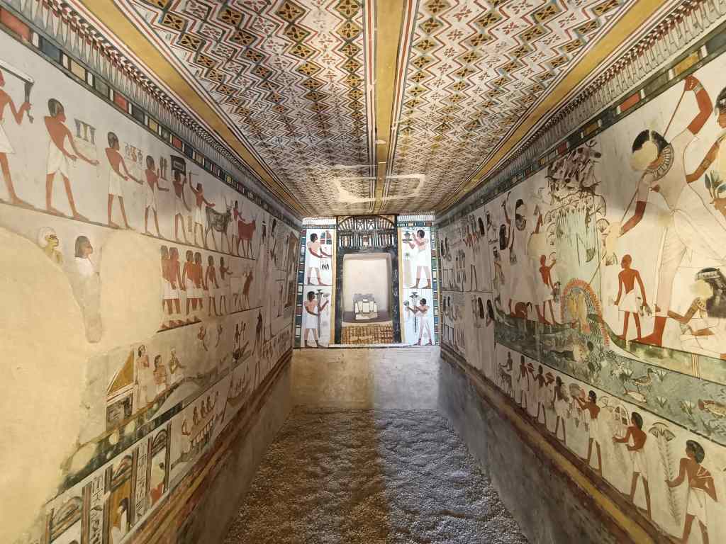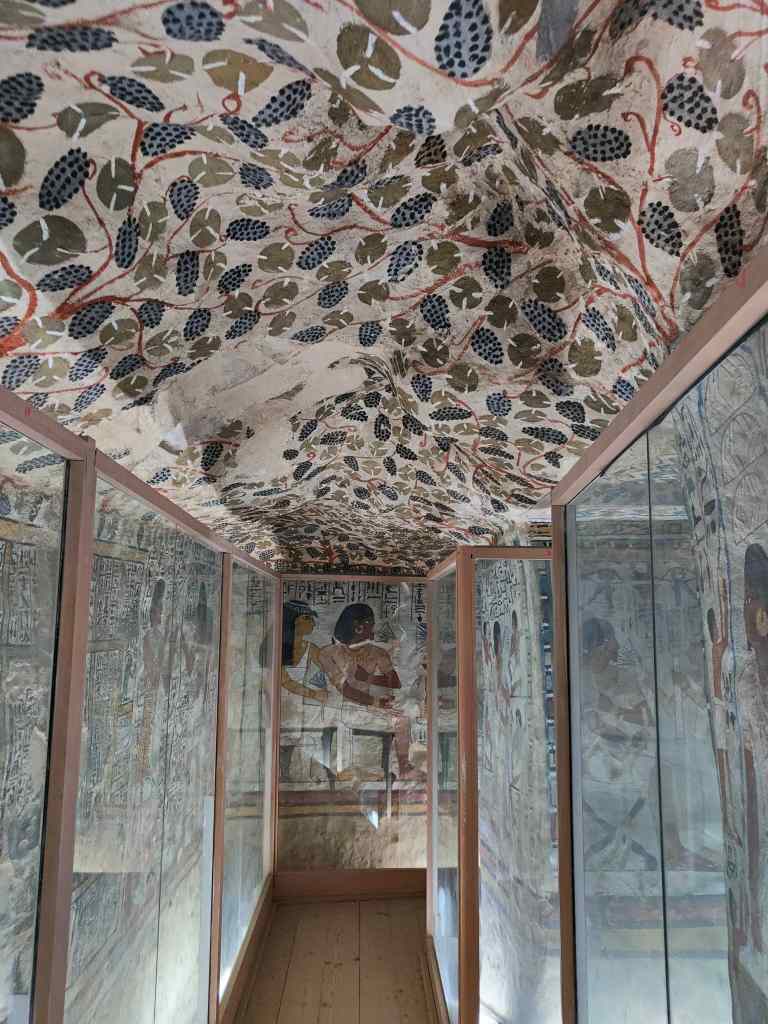 The final stop in today’s tour of Luxor’s West Bank was the area of the Tombs of the Nobles. These were by far the most impressive tombs of the day. They were built deep in the ground and their walls were covered with scenes of their daily life. My favourite was the tomb of Sennofer, the mayor of Thebes in time of Amenhotep II. Its roof was covered with paintings of vines and grapes – Sennofer was presumably a bon vivant.