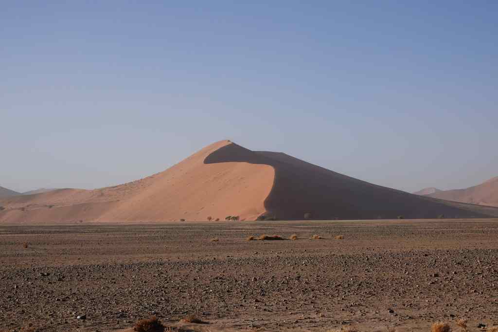 Proud of my achievement I headed back to the park gate to the small village of Sesriem and enjoyed a much needed coffee. I headed back to my bush camp to catch up on some lost sleep and to enjoy the pool before dinner. I had been surprised that my tour agent had booked me three nights near Sossusvlei, but now I was very glad – I had several more chances to see the largest dunes, at the end of the valley, under more favourable conditions. And my brief morning visited supported my guidebook’s assertion that the area was one of Africa’s most spectacular attractions.