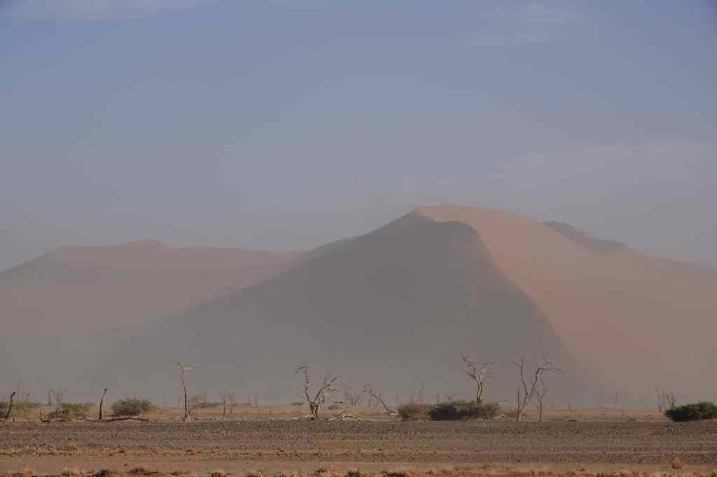 I continued right to the end of the road, where there was a parking area in a depression (or “vlei”) at the base of very largest dunes. I was greeted with an almost apocalyptic scene. Visitors struggled to open their car doors against the force of the wind, and then staggered around, holding onto their hats and bowing their heads to hide their faces from the stinging sand. I realised that visiting this part of the park was pointless and drove back to Dune 45, where conditions seemed to be better.