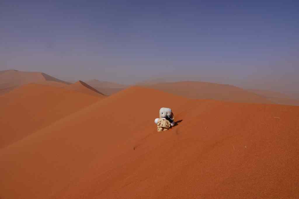 I parked at the base of the dune and struggled up the bright red sandy slope. My worries about not showering were soon forgotten as the wind sandblasted my fur, no doubt removing any possible dirt and a few layers of skin. It was a hard climb – for every little step forward I would slip backwards half a step in the sand.