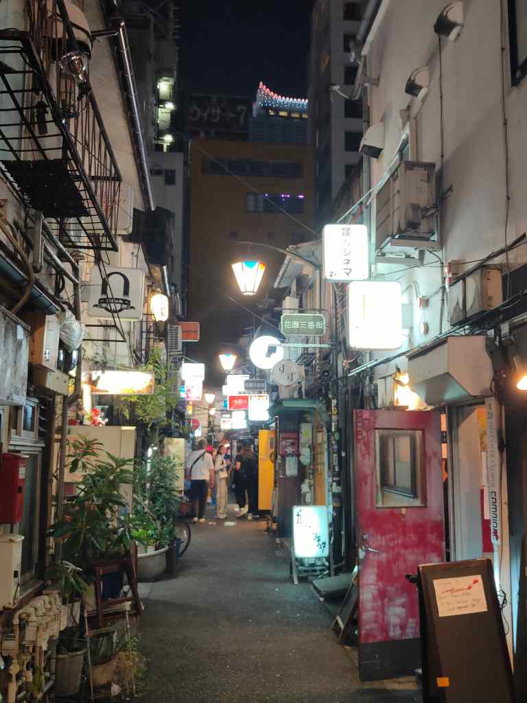 I spent my first night quietly and set out mid-morning the next day to explore. My Airbnb was in one of the few low-rise parts of Shinjuku where people actually live, and had narrow lanes, small houses, and a few scattered restaurants and convenience shops (including the ubiquitous 7-11). I stumbled across a small temple and then many small pedestrianised streets lined with restaurants.
