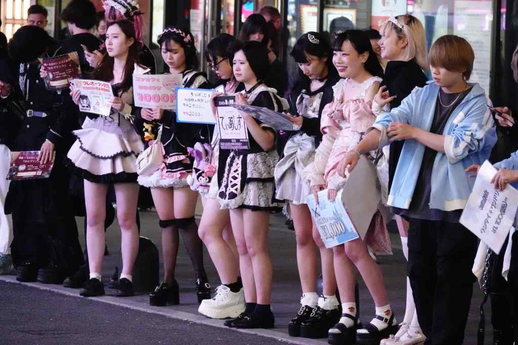 A short distance north of the station I came across a strange spectacle – attractive young people, some dressed stylishly, some suggestively, lined the road on either side, each carrying a sign with a price – usually 1000 to 2000 yen per hour or half hour. I was baffled, but later research on the internet revealed that these people are recruiting customers for the nearby lounge bars, where in addition to the (probably expensive) drinks, you pay for time spent with a pretty young girl or boy.