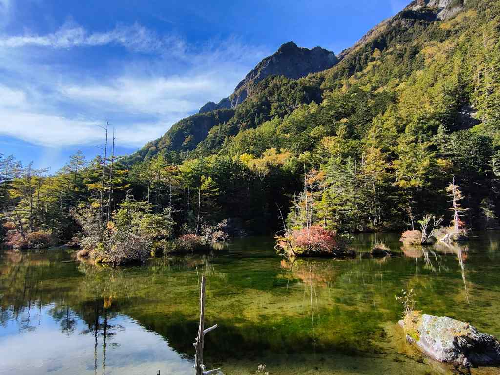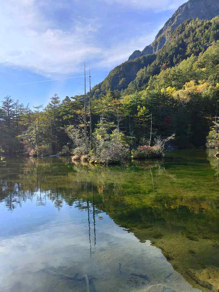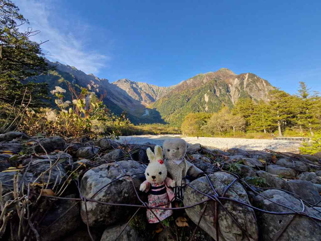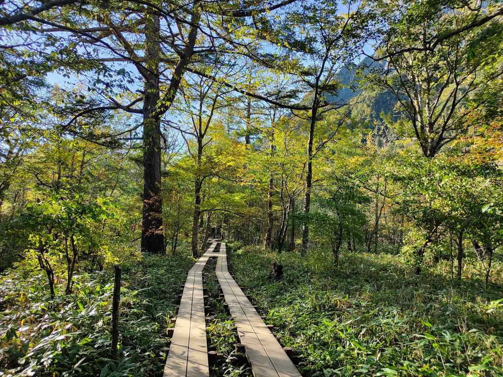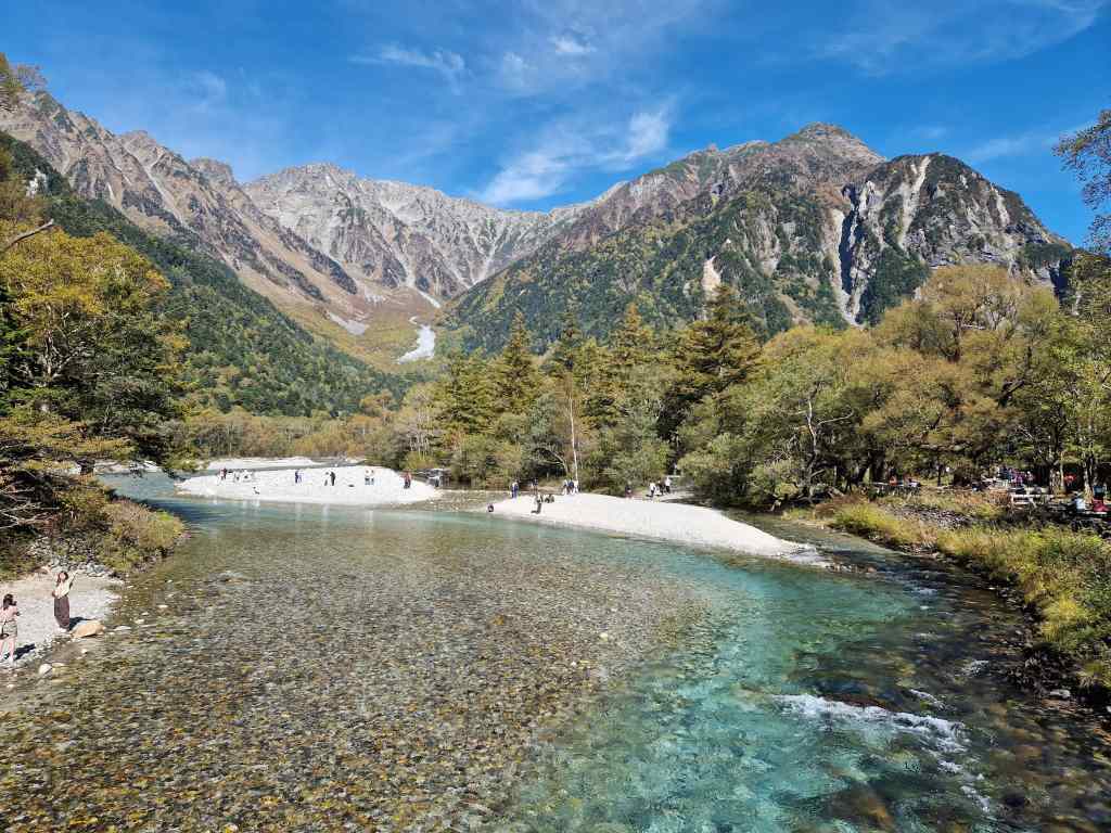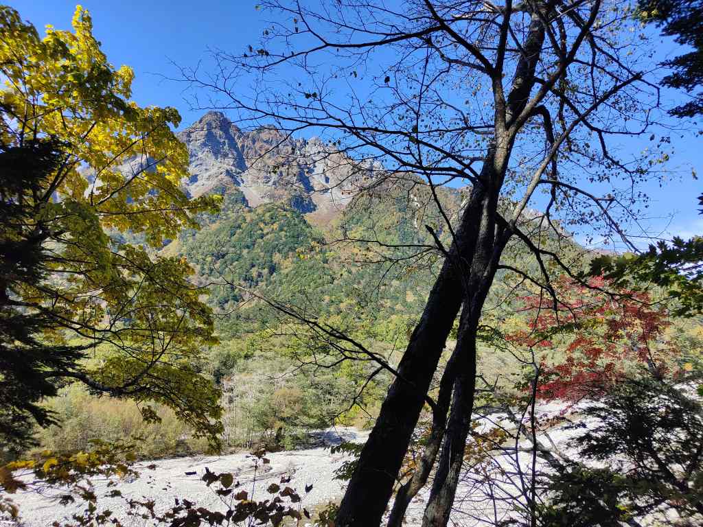 A short walk took us the popular Kappabashi bridge, with great views up and down the valley, including an iconic vista of the Hotaka peaks. It was crowded with tourists trying to take selfies, so we didn’t stay long and instead set off on our walk. It was a beautiful day, and the autumn leaf colours were spectacular, with all shades of green, yellow and gold – although we didn’t see much of the brilliant red colours that we had been expecting.