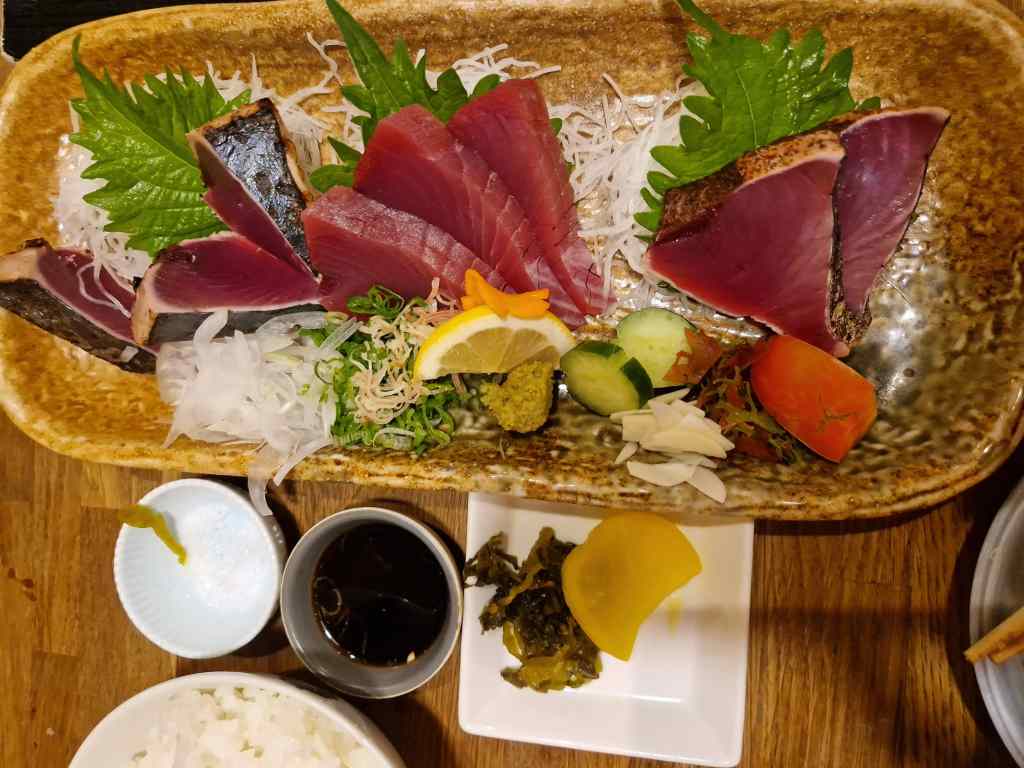 We checked into our hotel – it was one of only two modern-style hotel rooms we had booked for the whole trip, and seemed to be used mostly by business travellers. Our room was small, but comfortable enough. After unpacking we set off straight for dinner. Like any port city in Japan, Kochi is known for its seafood and its speciality is seared raw tuna. We ordered some and got a huge plate for a price that back home would have got you one small tuna steak in a supermarket.