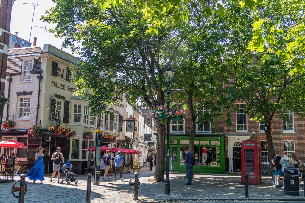 From the station, people’s first stop is usually Richmond Green, a pleasant expanse of grass where people still play cricket on summer weekends. It is lined with stylish houses and some good pubs. Leading off from the Green are several small passages with many trendy shops – including the Ted Lasso shop.