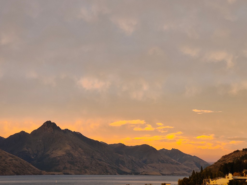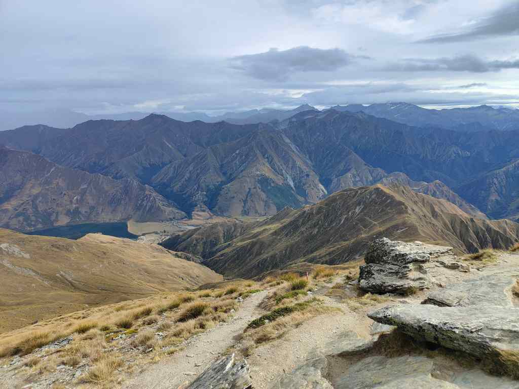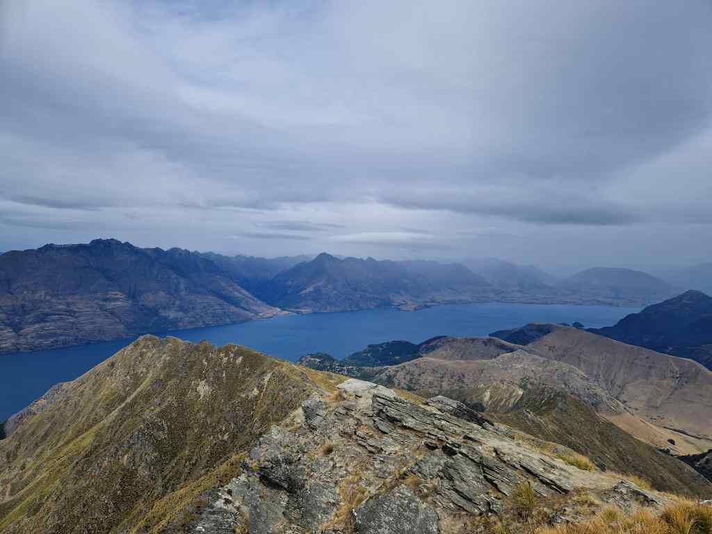 The summit offered 360° views. In the west I could see Queenstown far below, whilst to the east mountains towered out of a bank of approaching dark clouds. The mountains to the south, in the Fjordland National Park (subject of a future post), still carried the vestiges of last winter’s snow. I enjoyed the views and snacked on some chocolate bars until the first drops of rain on my fur announced that it would be a good time to head back down.