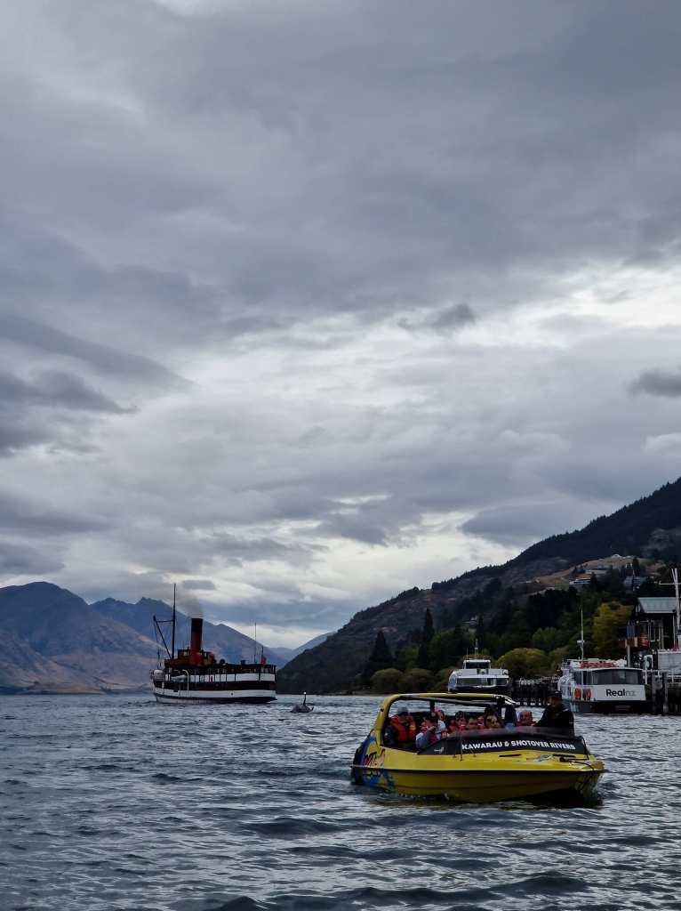 Our boat returned to the quay with happy passengers. On arrival, we could see almost the whole range of Queenstown boating options – a traditional old wooden ferry, a jet boat, and a strange two-seater shark-shaped vessel (just visible in the photo below), part way between a boat and a submarine, which was apparently capable of great speed.