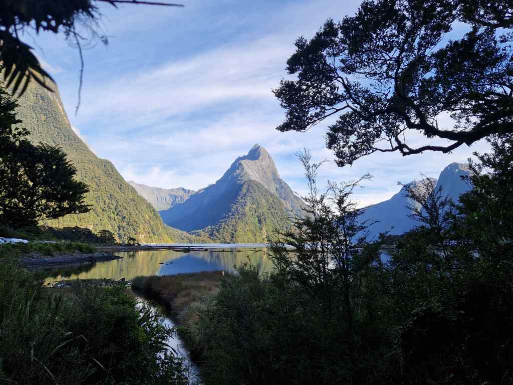I arrived in good time, parked my car and strolled through an empty parking area for buses to the ferry terminal. On the way I stopped to admire Mitre Peak, an iconic landmark of Milford Sound.