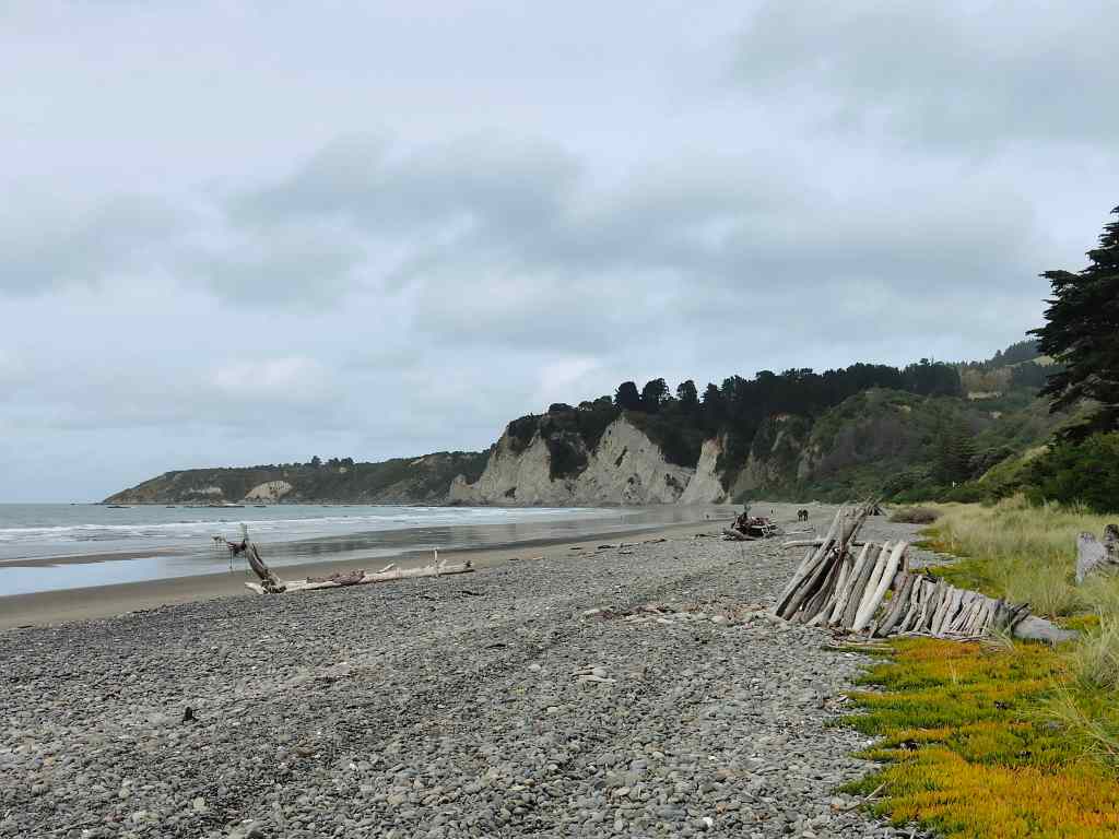 Today I drove up the east coast of New Zealand’s South Island from Christchurch to Kaikoura, a destination famous for its marine life. Around half way along the road, a sign offered a scenic drive around Gore Bay. It wasn’t in either of my guide books but I decided to give it a try, and was rewarded with one of those “off the beaten track” discoveries that makes travelling fun. After a bit of driving past some interestingly-shaped cliffs (the Cathedral Gully), a little path planted with sub-tropical flowers led from the road to the beach. I was almost the only one there, and took time to savour a moment of solitude.