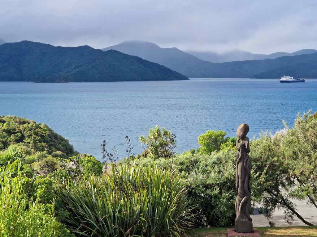 The Marlborough Sounds are the estuaries of a series of rivers emptying into the Cook Strait between New Zealand’s North and South Islands, which form a jagged coast with countless islands and peninsulas. Indeed, this relatively small area contains around a quarter of the total length New Zealand’s coastline. The Sounds are very thinly populated, with a few fishing towns, holiday homes, campsites and resorts. Much of the area – and many of the resorts – is only accessible by boat, but a few narrow, winding roads also lead into the region. I had booked a resort on one of side roads leading off from the popular Queen Charlotte’s Drive scenic route which links Picton and the small port of Havelock. The route would have been beautiful….had the sun made an appearance to bring out the colours of the water and vegetation. But instead the weather was stubbornly overcast, and the sea remained a dull grey colour. After an hour of scenic but slow driving I arrived at my resort.
