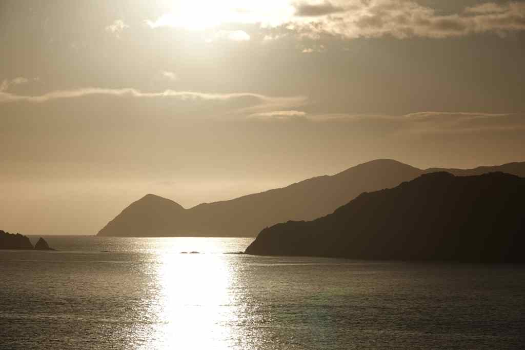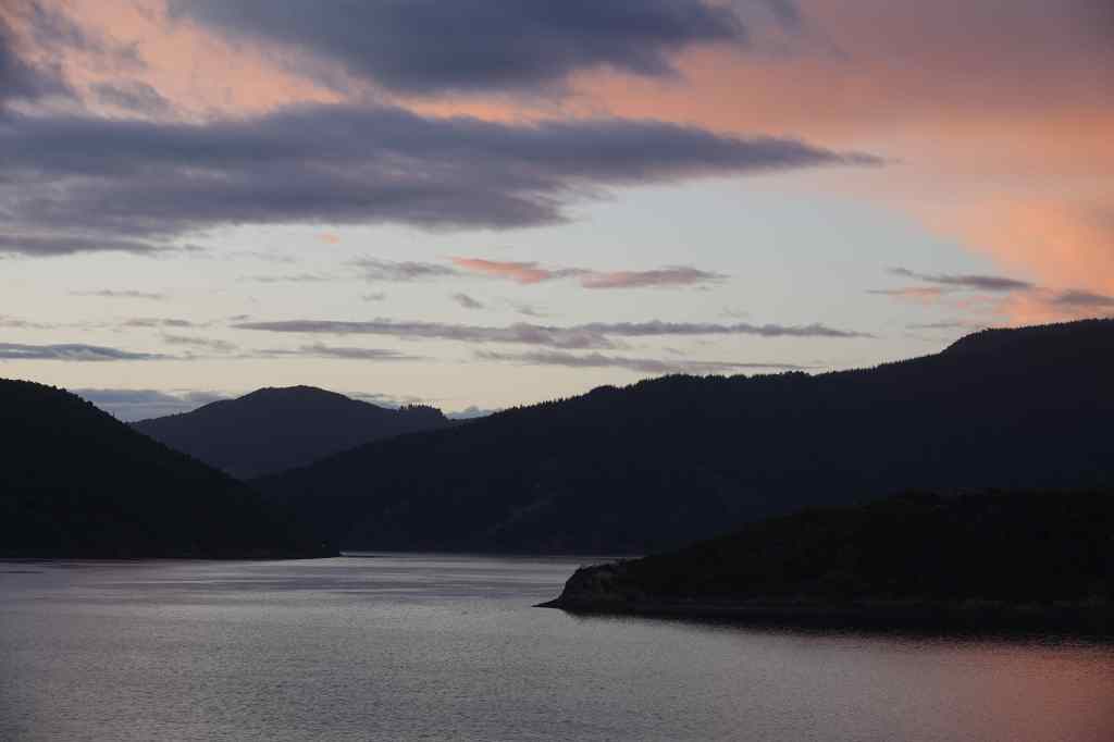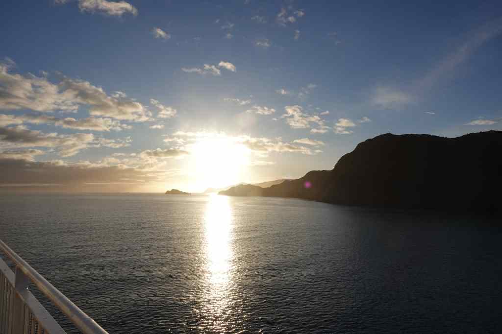 This morning I had to get up unreasonably early to check in for my ferry across the Cook Strait from Picton on the South Island to Wellington on the North Island. I had booked a crossing at 09.30 but the ferry company brought this forward to 07.30 and also required that I turn up at least sixty minutes before to check in, so I had to sit for an hour in the dark in a queue of cars waiting to board. The ferry was not full and after boarding I had lots of space to sit and relax in front of a large (and – shame on Interislander Ferries – also dirty) viewing window in the passenger lounge. We set sail just as the sun began to rise and I went out on deck to get some last views of Queen Charlotte Sound.