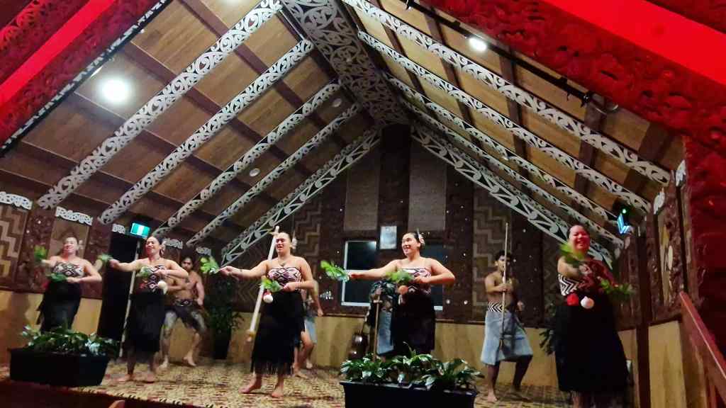 When that didn’t work the final warrior put down a leaf on the floor in front of our leader, a peace offering showing that we were welcome to visit them. Once everyone was inside and seated, there was another Maori tradition, the powhiri, or speech of welcome – spoken only in Maori. With the lengthy formalities over, our hosts switched to English to welcome us and explain the series of Maori songs and dances they presented, including the famous haka war dance.