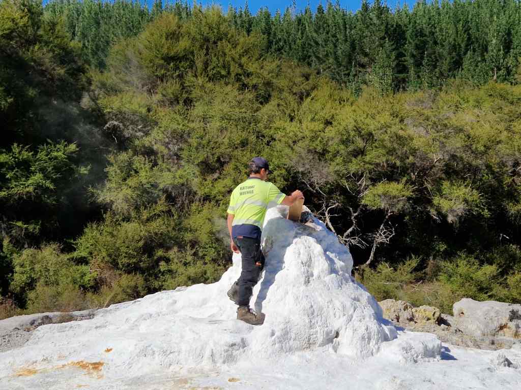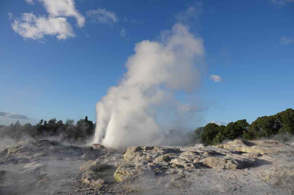 Today was my last day in New Zealand. I have been here nearly four weeks, and the time has flown past. I visited one last geothermal park outside of Rotorua called Wai-O-Tapu. My visit started at Lady Knox Geyser, which erupts at 10.15 every day. I was a little puzzled by the precision of this event – surely a natural phenomenon like a geyser should be at least a bit variable, and what happens when New Zealand goes from summertime to wintertime (as it just had)? All was revealed when I joined a large group of tourists sitting in an amphitheatre around the geyser. One of the park employees explained that the geyser had been discovered when a group of workers had been washing their clothes in the nearby hot springs. They introduced some detergent into the water, which triggered a spectacular eruption (and panic amongst the surprised workers, who ran around naked to escape). In modern times, at 10.15 every day, a park employee puts some detergent down the hole of the geyser to trigger an impressive, if partially artificial, spectacle.