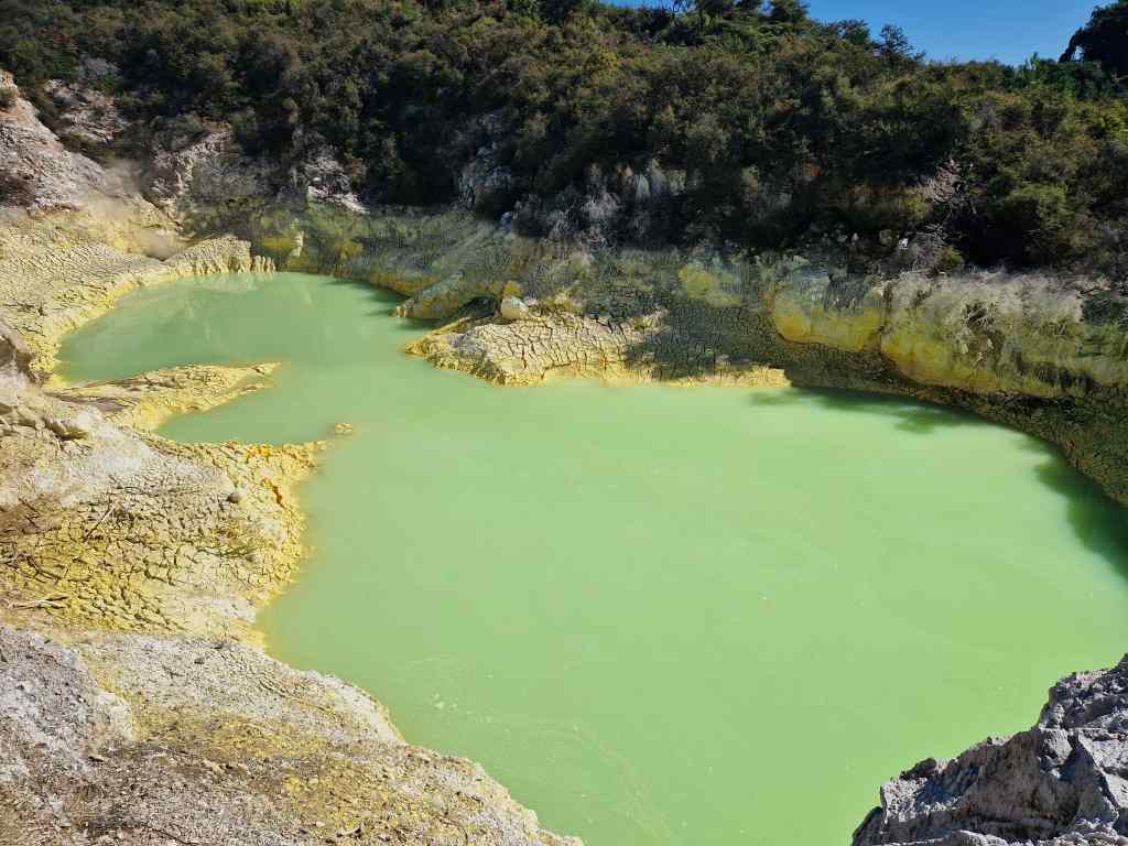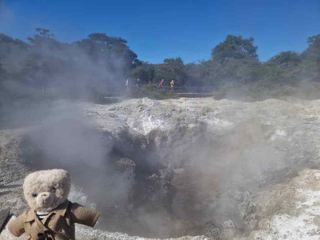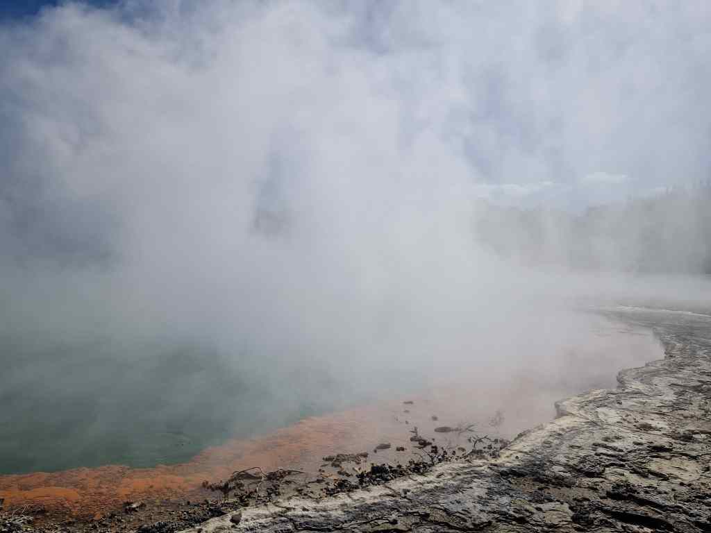 With the geyser show over, the crowd headed to the park’s main entrance to start out on a path through a prehistoric landscape of bubbling mud pools, smoking hot springs and tranquil lakes. Wai-O-Tapu park is particularly known its brightly coloured rock formations, including the famous Champagne Pool.
