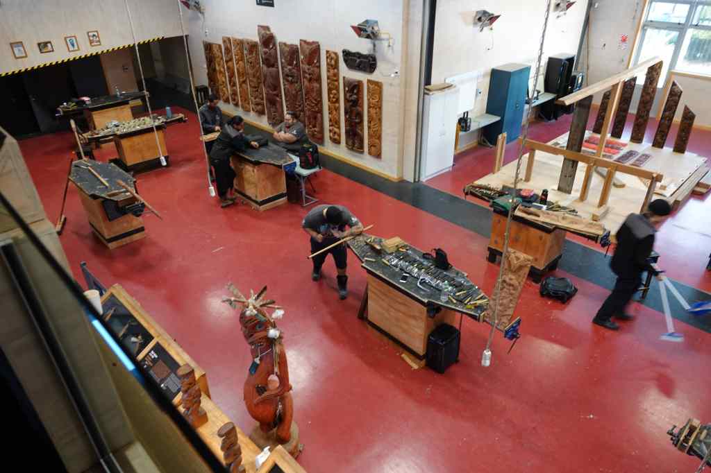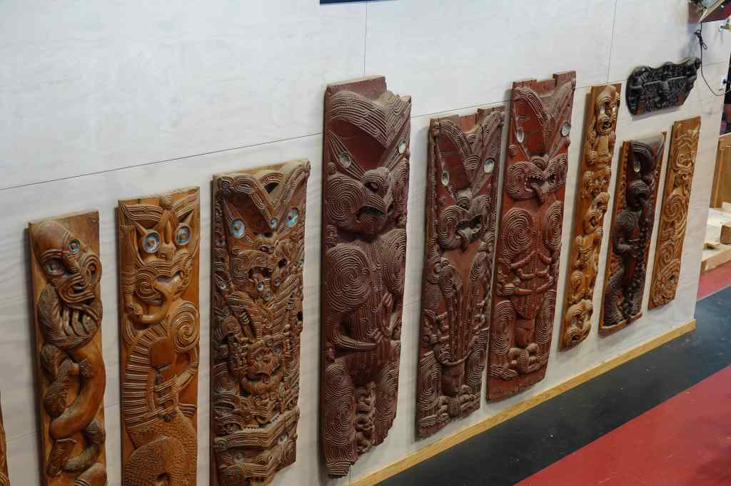 After a couple of hours exploring Wai-O-Tapu, it was time for a complete change – a tour of the Maori cultural centre Te Puia. After the slightly sad experience of visiting the neighbouring village of Whakarewarewa, my expectations were not so high, but I was pleasantly surprised. The visit started with a visit to a training centre where students learn Maori crafts like sculpture (a male activity) or weaving (a female one), where we got to see some wonderful pieces of art.