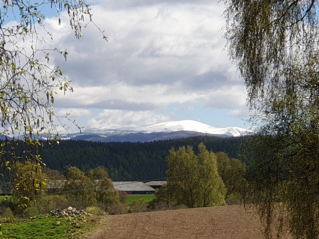 My road then took me back to the Cairngorm Mountains. At first it went through green meadows, with the snow-topped mountains flitting in and out of view in the distance. I stopped briefly at the pretty little town of Ballater, on the River Dee…..